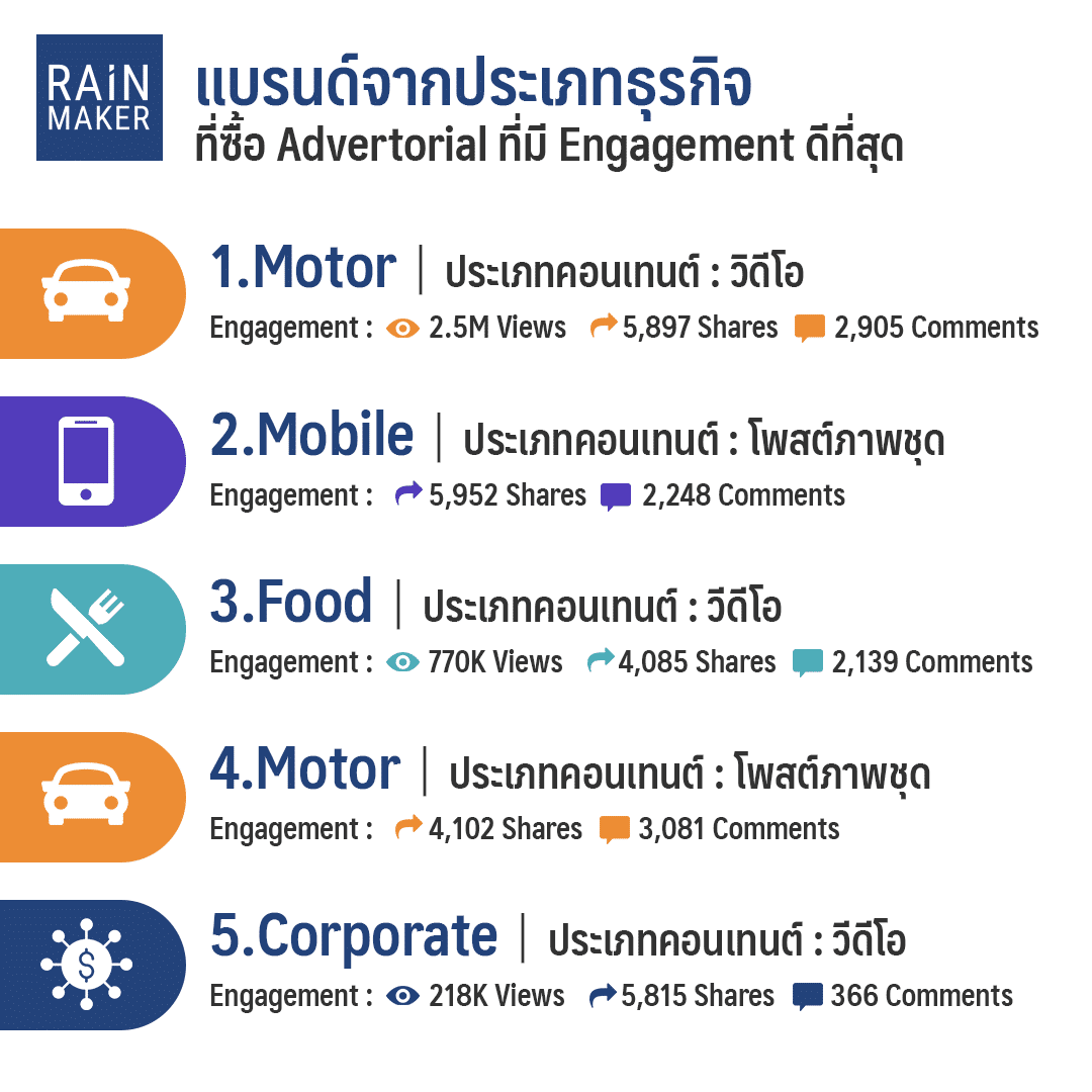 แบรนด์จากประเภทธุรกิจที่ซื้อ Advertorial ที่มี Engaement ดีที่สุด 5 ลำดับ จาก 1,614 โพสต์ แน่นอนว่าแต่ละแบรนด์มี KPI จาก Engaement แตกต่างกันไป แต่หากการพรีเซนต์คอนเทนต์นั้นน่าสนใจหลายๆครั้งที่เกิดเป็นไวรัลและสร้างปรากฏการณ์เกิน KPI ที่แบรนด์คาดหวังไว้ ลองมาดูลักษณะคอนเทนต์และยอด Engaement ที่ได้รับการตอบเป็นอย่างดี และจาก 5 คอนเทนต์นี้ มาจาก 3 Publisher เท่านั้น