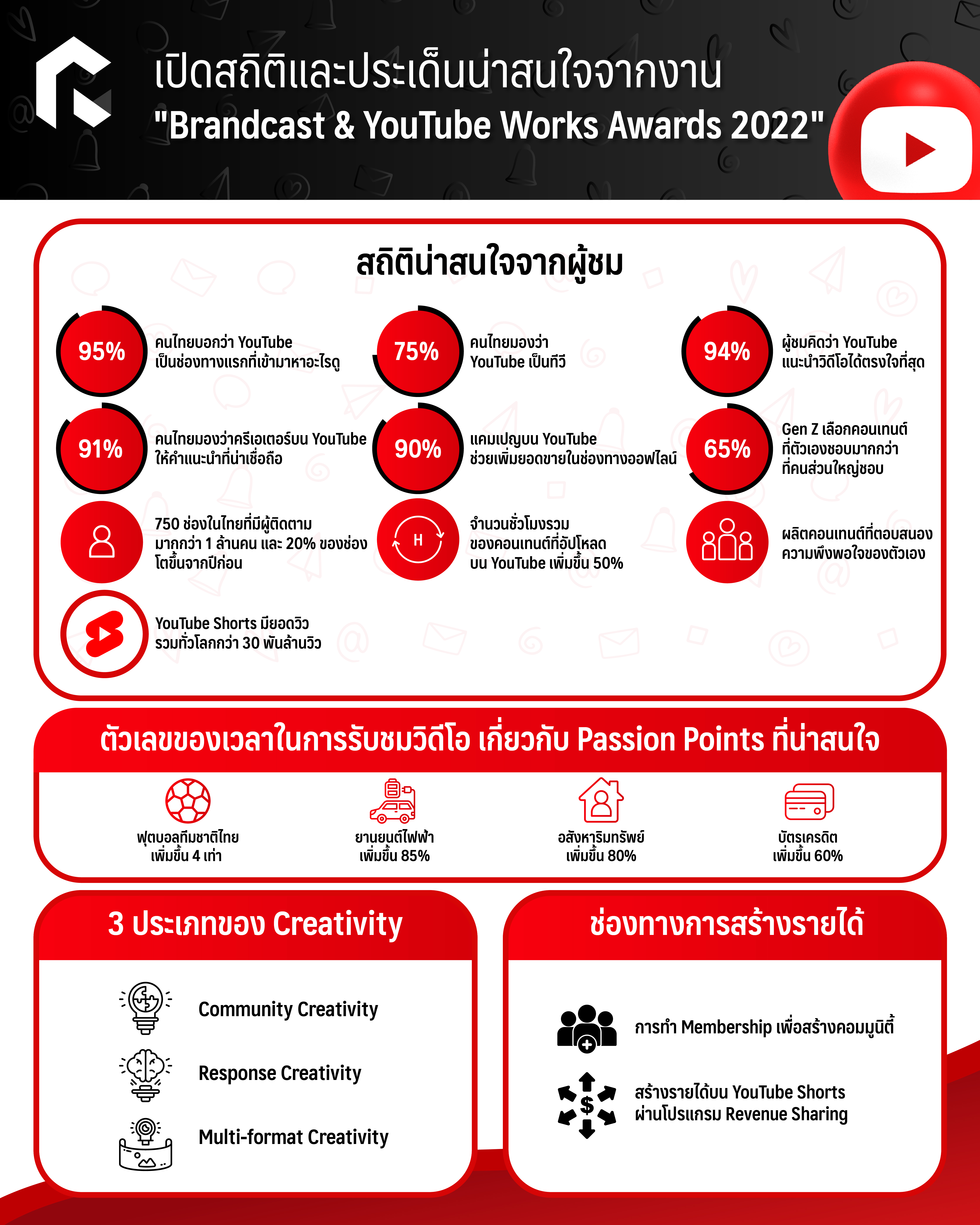 เมื่อวานนี้ (27 ก.ย.) ที่ผ่านมา YouTube ประเทศไทยได้จัดงานใหญ่ “Brandcast & YouTube Works Awards 2022” ชวนทุกคนมาอัปเดตเทรนด์และสถิติน่าสนใจ เพื่อเป็นประโยชน์ให้กับทั้งแบรนด์ และครีเอเตอร์ในการนำไปพัฒนาคอนเทนต์ของตัวเอง รวมถึงมีการประกาศรางวัล YouTube Works Awards 2022 ทั้ง 7 รางวัลด้วยกัน