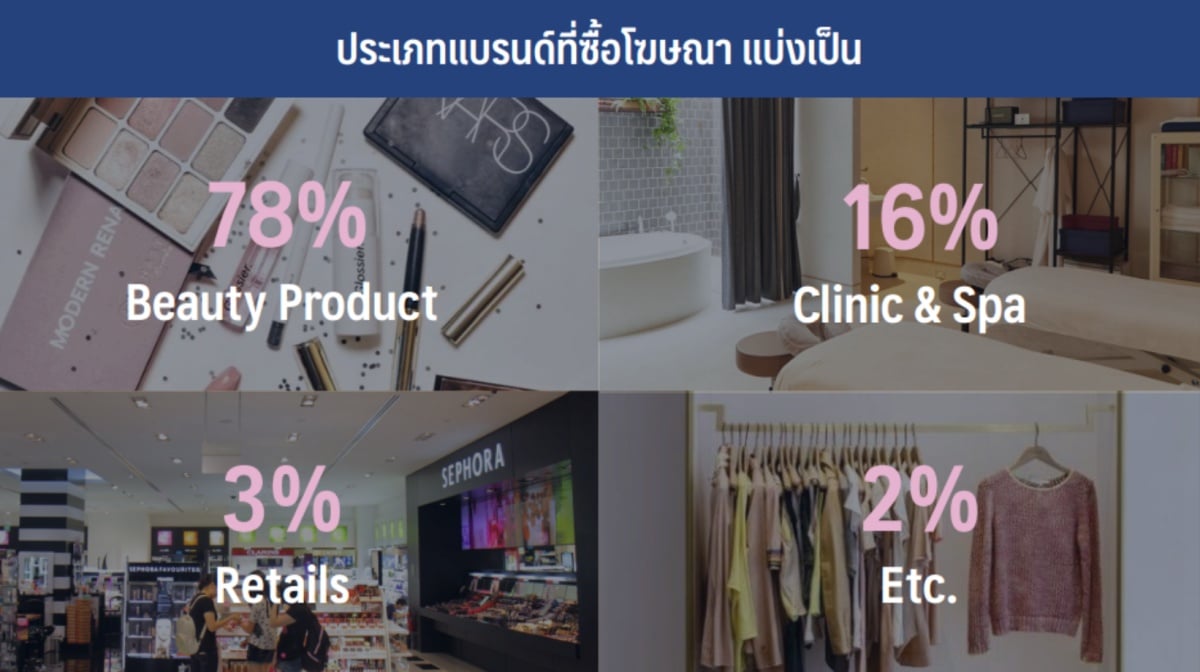 สินค้าบิวตี้โดยตรง เช่น เครื่องสำอาง สกินแคร์ แบ่งเป็น 78% คลินิกความงาม และสปา แบ่งเป็น 16% ห้างร้าน 3% ดังนั้น หากใครสนใจทำคอนเทนต์สายบิวตี้ ควรโฟกัสไปที่ Beauty Product ก่อน