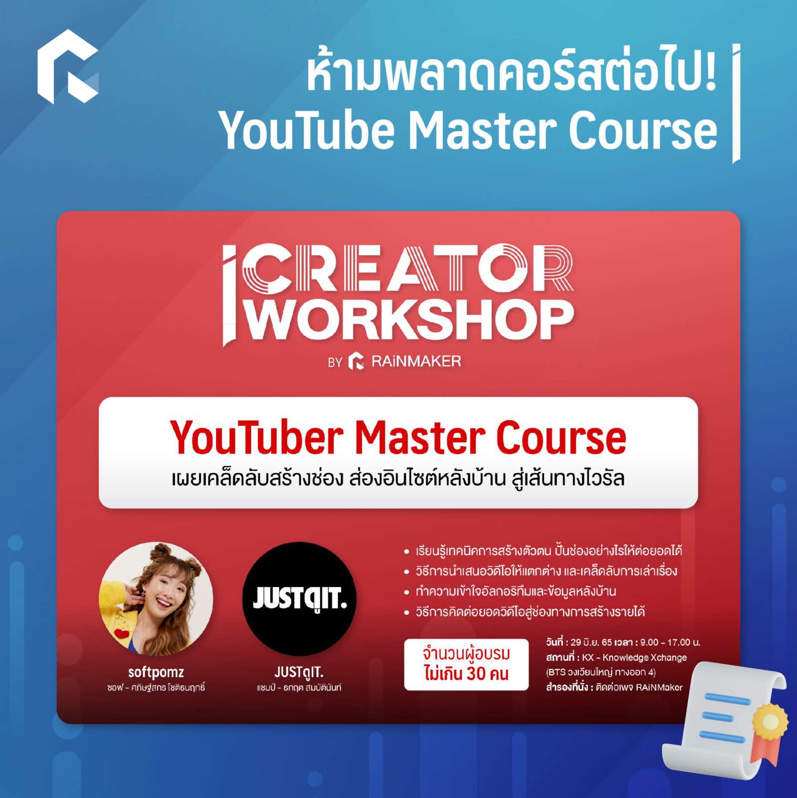 พร้อมให้ทุกคนมาอัปสกิลสร้างช่อง YouTube โดยกูรูผู้มากประสบการณ์ในวงการ YouTuber อย่าง Softpomz และ แชมป์ JUSTดูIT. ที่จะพาคุณไปค้นหาตัวตนที่ใช่ พร้อมเจาะลึกการคิดคอนเทนต์ ต่อยอดให้ช่องปังขึ้นกว่าเดิม