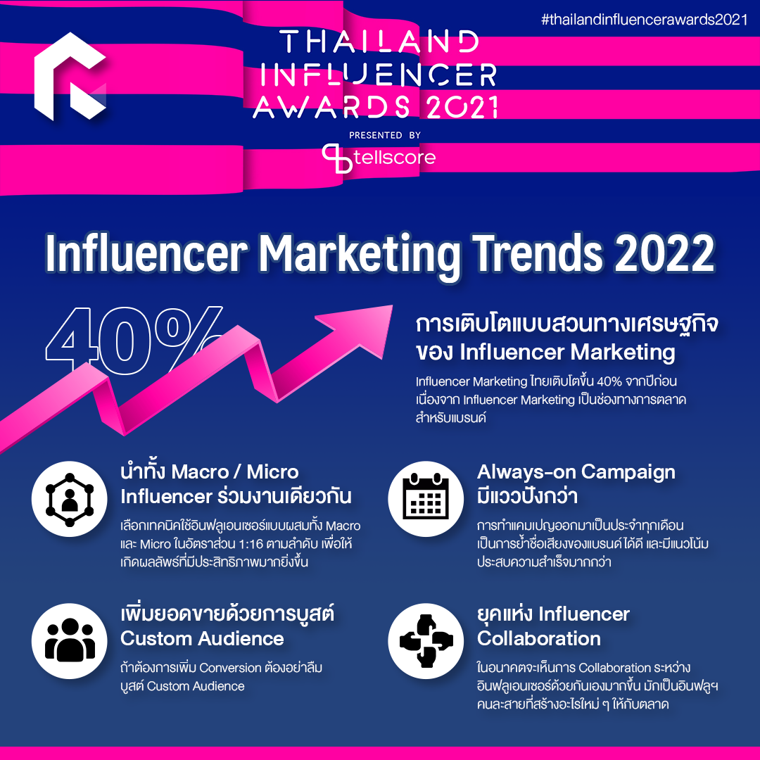 การใช้จ่ายด้าน Influencer Marketing ไทยเติบโตขึ้นถึง 40% จากปีก่อน และยังคงมีแนวโน้มเติบโตขึ้นเรื่อย ๆ ในอนาคต เนื่องจาก Influencer Marketing ไม่ได้เป็นเพียงช่องทางโฆษณาเท่านั้น แต่ยังเป็นช่องทางการตลาดสำหรับแบรนด์ได้อีกด้วย