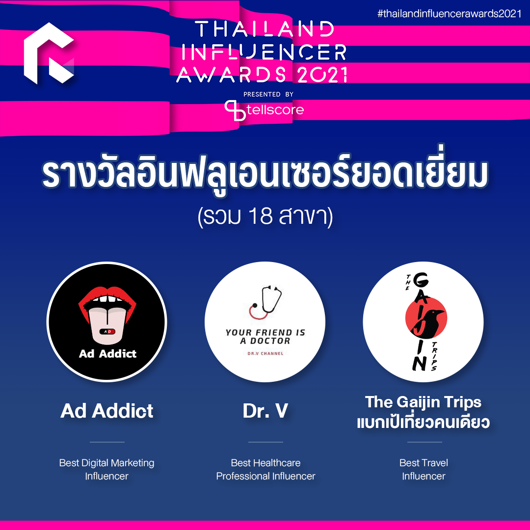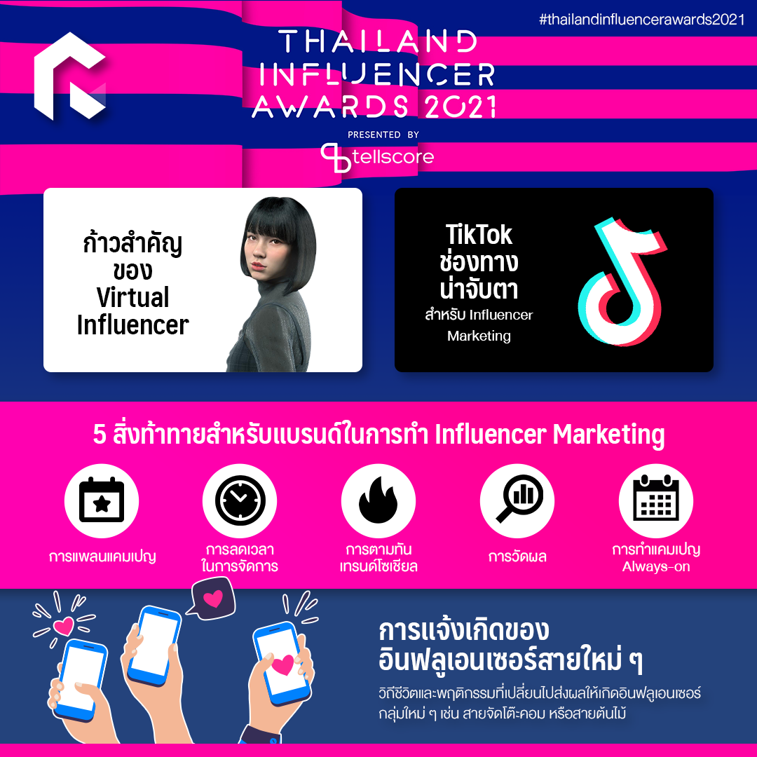 กลับมาอีกครั้งกับงาน “Thailand Influencer Awards 2021″ ที่จัดโดย บริษัท เทลสกอร์ จํากัด (Tellscore) หนึ่งในผู้นําด้าน Influencer Marketing Platform ที่ได้จัดงานต่อเนื่องกันมาถึง 3 ปีด้วยกัน
