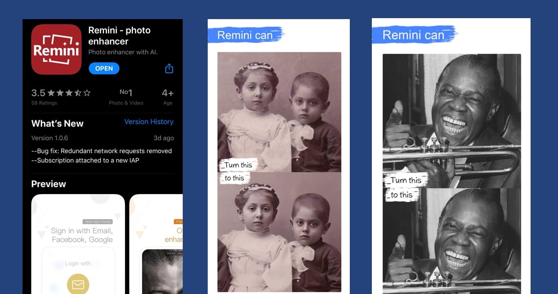 Remini เป็นแอปฯ แต่งภาพออนไลน์แบบ real-time โดยเน้นไปที่การแก้ไขจุดบกพร่องของรูปภาพ เบื้องต้น Remini จะให้เรานำภาพไปทำได้แบบฟรี โดยมีโควต้า 3 ภาพต่อวันเท่านั้น หรือสามารถเสียเงิน subscribe เพื่อที่จะใช้งานได้แบบ unlimited