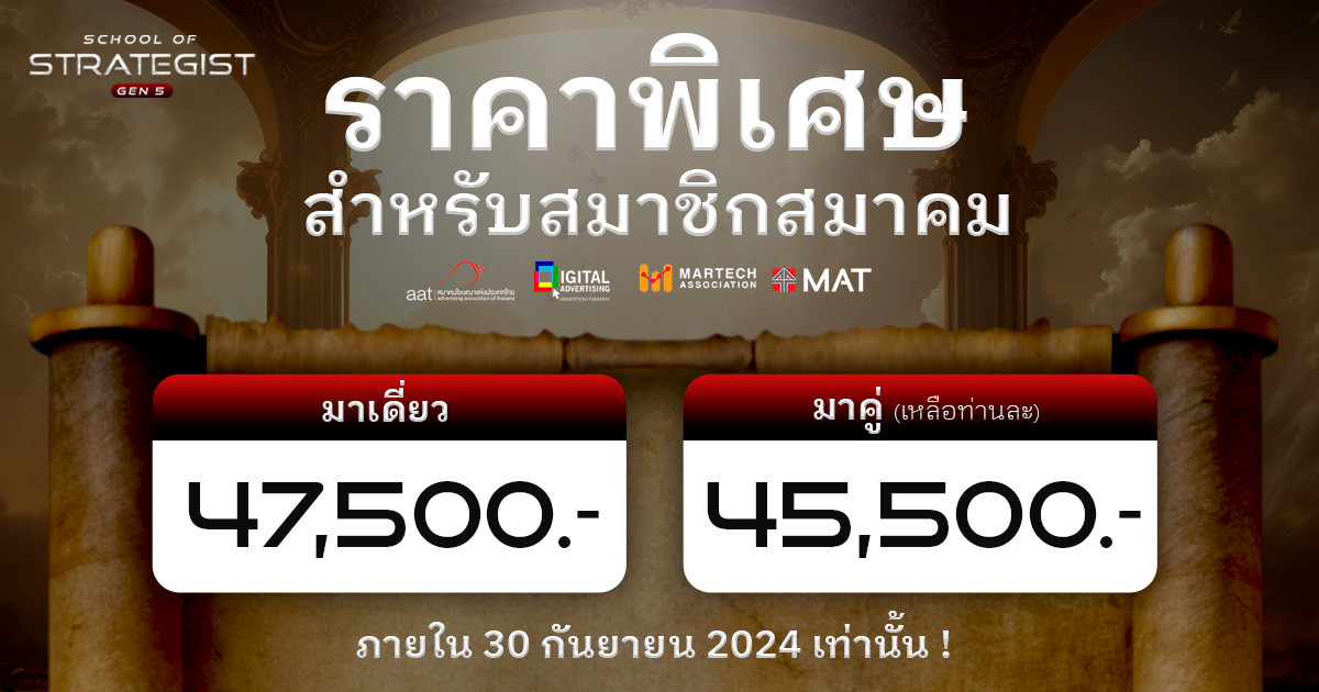 งานนี้ใครที่อยากเป็นนักกลยุทธ์ต้องห้ามพลาดโอกาสดี ๆ แบบนี้เด็ดขาดนะครับ เพราะนอกจากจะได้เรียนคอร์สยอดฮิตอย่าง School of Strategist (SOS) แบบเต็ม ๆ คอร์สแล้ว ยังมาพร้อมโอกาสในการสร้างคอนเนคชัน สานสัมพันธ์กับเพื่อนในวงการการตลาดแบบจัดเต็มอีกด้วย ว่าแล้วก็รีบไปสมัครด่วน !