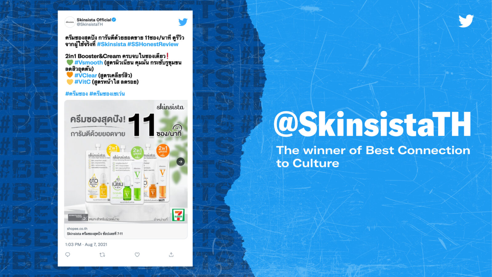 สำหรับวงการสกินแคร์แม้จะมีการสื่อสารจากแบรนด์ไปสู่ผู้บริโภคหลากหลายแบบ แต่จุดยืนของ “Skinsista” ยังคงหนักแน่นกับการเป็นแบรนด์ที่มีกลยุทธ์การตลาดผสมผสานไปกับความสบายใจของผู้บริโภค ซึ่งประกอบไปด้วยการให้ฟีดแบคตามความชอบและไม่ชอบในผลิตภัณฑ์ผ่านแฮชแท็ก #SSHonestReview บน Twitter จึงทำให้แคมเปญนี้ชนะรางวัล #BestOfTweets 2021 สาขา Best Connection to Culture จากการ Blend กันอย่างลงตัวระหว่างจุดยืนของแบรนด์ที่อยากเข้าใจผู้บริโภค และจุดยืนของผู้บริโภคที่อยากเข้าถึงแบรนด์