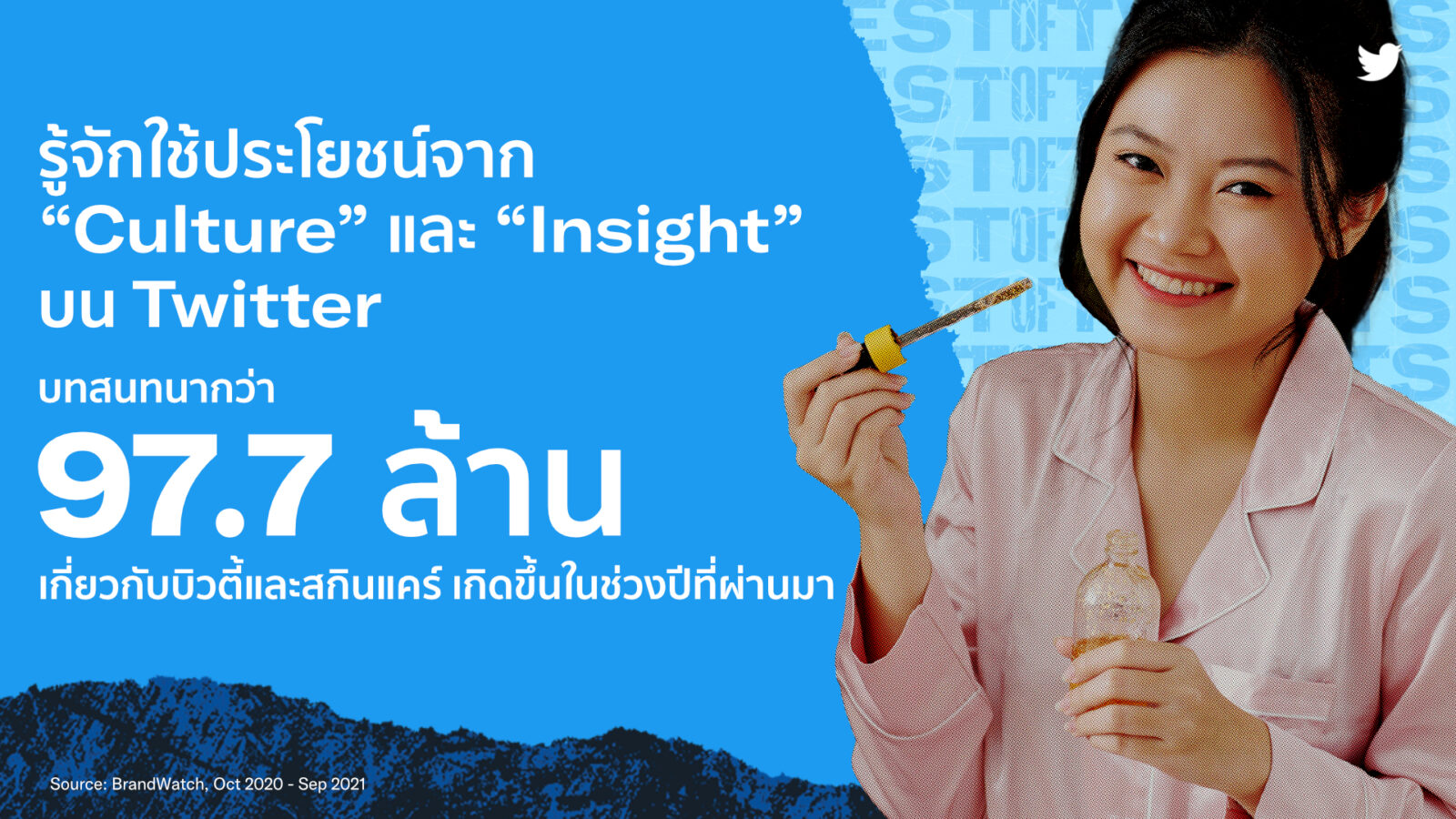 การจะนำประโยชน์จาก  “Culture” และ “Insight” บน Twitter ไปใช้ในการพัฒนาการสื่อสารของแบรนด์ ทาง “Skinsista” มองว่าต้องเริ่มจากการเข้าใจกลุ่มเป้าหมายของแบรนด์ก่อน โดยเฉพาะกลุ่มเป้าหมายของแบรนด์ที่เป็น ‘Young Generation’ อายุระหว่าง 18-23 ปี ต้องใช้ความเข้าใจมากกว่าการรับรู้เพียงอย่างเดียว เพราะในโลกของแพลตฟอร์มฟีดบทสนทนาที่ไม่เคยหยุดนิ่งอย่าง Twitter ผู้บริโภคมีการพูดคุยเกี่ยวกับบิวตี้และสกินแคร์ไปกว่า 97.7 ล้านบทสนทนาในช่วง 1 ปีที่ผ่านมา (Source: BrandWatch, Oct 2020 – Sep 2021)