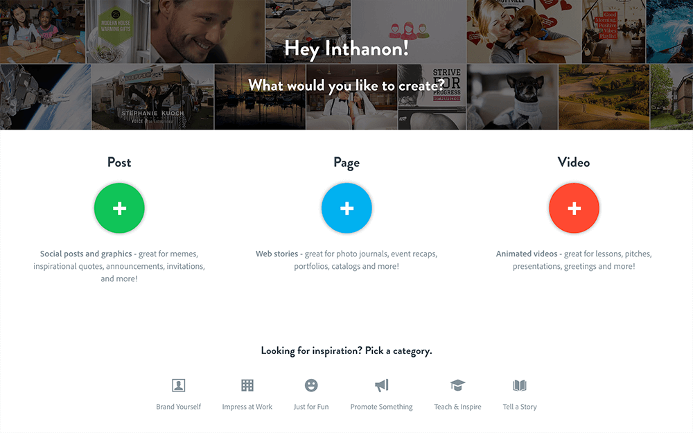 เสื่อสมัครสมาชิกและ Login ผ่านเข้าไปเราก็จะเจอทางเลือกที่ให้เราสามารถเลือกสร้างผลสิ่งที่เราต้องการได้ทั้ง Post(Social Graphic), Page(Website) และ Video ซึ่งในขั้นตอนนี้ทางเราได้ทำการเลือกแบบ Post ไปเพื่อทดสอบ