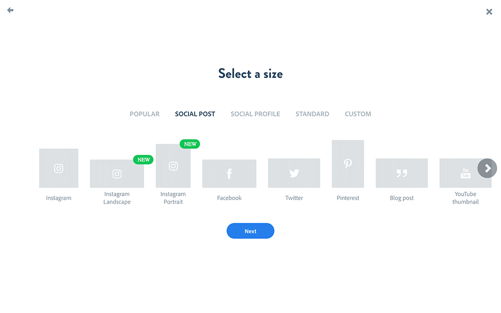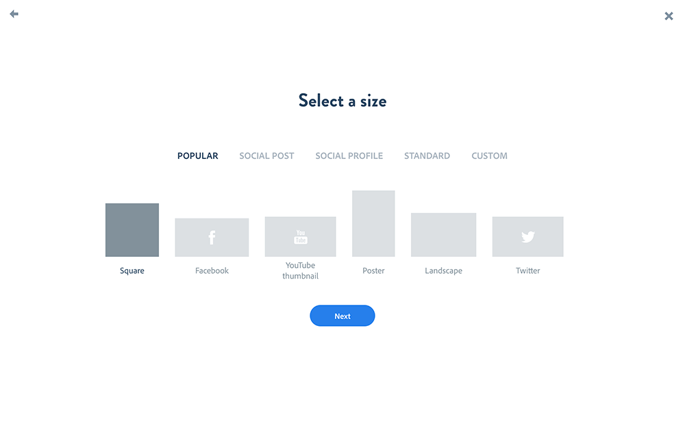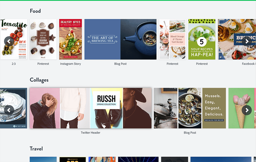 พอกดในส่วนของการสร้าง Post ระบบจะพาเข้าไปสู่หน้าของ Template ที่ทาง Adobe ทำไว้ให้เลือกเยอะมากๆ และยังมีทุกขนาดทุกสัดส่วนทั้ง Facebook, IG, Pinterest, Twitter และอีกมากมาย