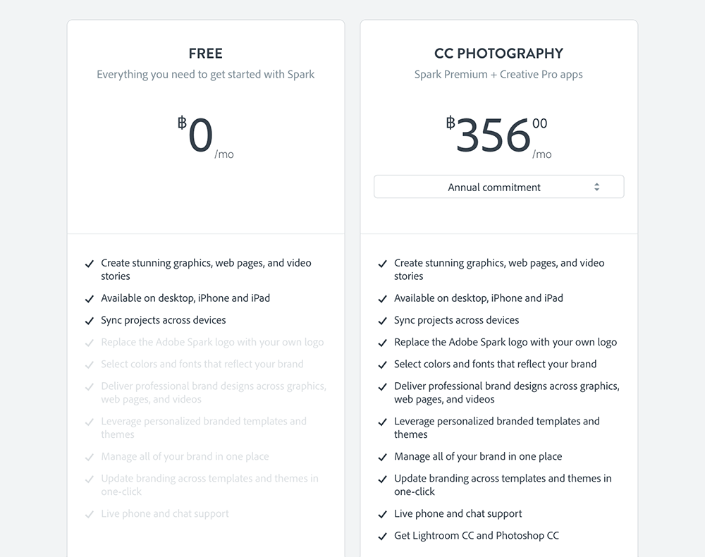 ตามจริงแล้ว Adobe Spark เป็นโปรแกรมฟรีสำหรับสมาชิก Adobe ที่ได้จ่ายรายเดือนหรือรายปีอยู่แล้ว ซึ่งแพลนที่ถูกสุด Photography คือ 356 บาท จะได้ Adobe Photoshop CC , Lightroom CC และจะสามารถใช้งาน Adobe Spark ได้แบบครบทุก Features