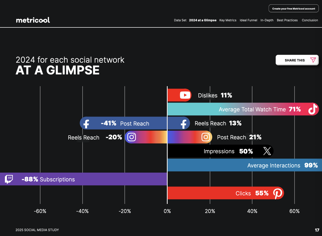 โดยอินไซต์จากรีพอร์ต “Social Media Study” ของ metricool นั้นมีชุดข้อมูลที่สำรวจมาจากผู้คนที่มีแอ็กเคานต์ทั่วโลกกว่า 1,387,457 แอ็กเคานต์ และ 21,211,149 โพสต์ตั้งแต่ช่วงเดือนกันยายนปี 2023 มาจนถึงเดือนกันยายนปี 2024 ซึ่งแต่ละแอ็กเคานต์ก็มีขนาดผู้แตกต่างกันไป เลยทำให้อินไซต์ของแต่ละแพลตฟอร์มเปลี่ยนไปด้วย เมื่อเทียบกับปี 2023