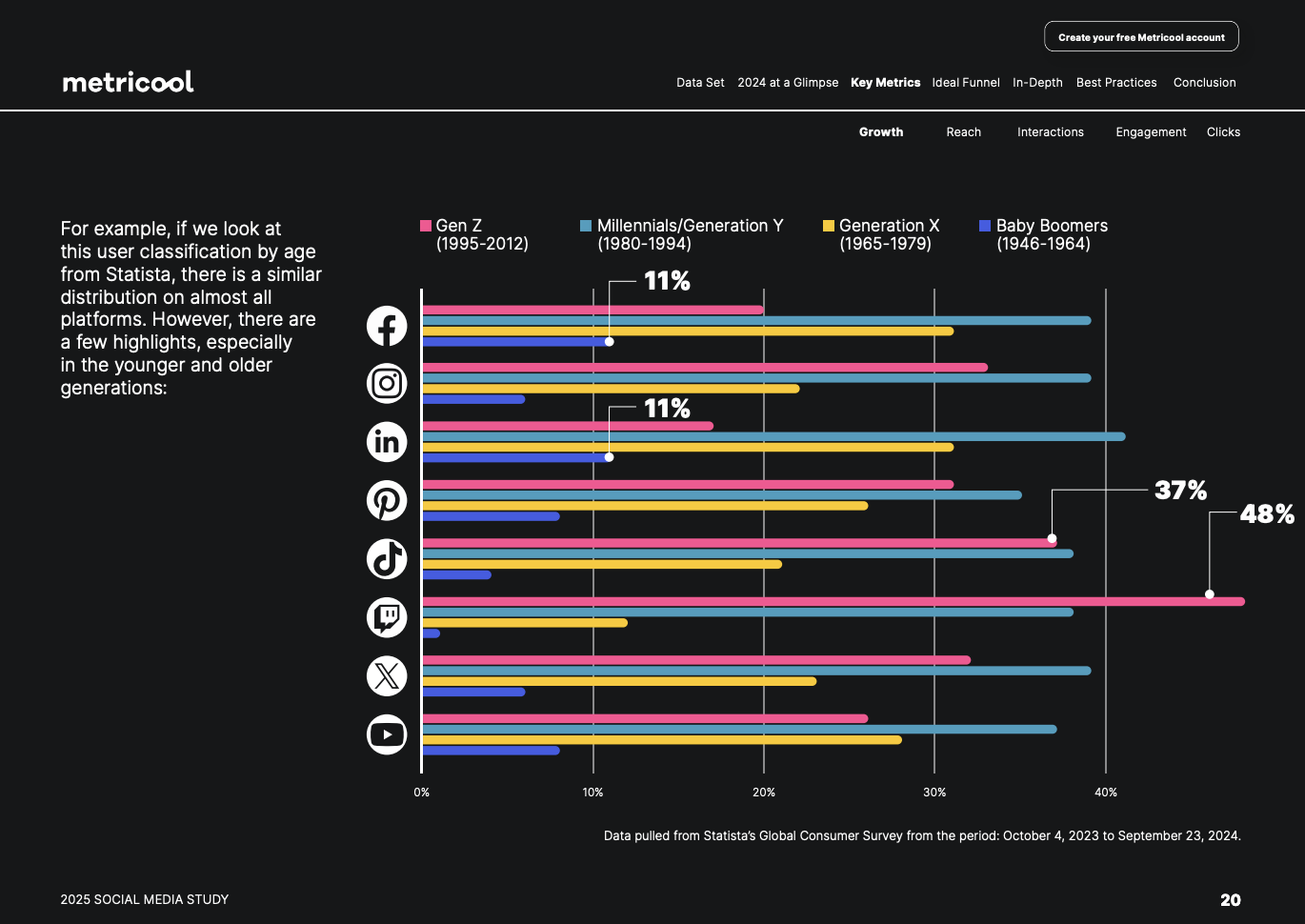 นอกจากสถิติการเติบโต และการลดลงของมาตรวัดสำคัญแต่ละแพลตฟอร์มแล้ว ด้านของผู้ชม (Audience) แต่ละช่วงวัย (Generations) ที่อยู่ในแพลตฟอร์มก็มีการเปลี่ยนแปลงเช่นกัน เพราะในแต่ละเจนก็ให้ความสนใจแพลตฟอร์มต่างกัน
