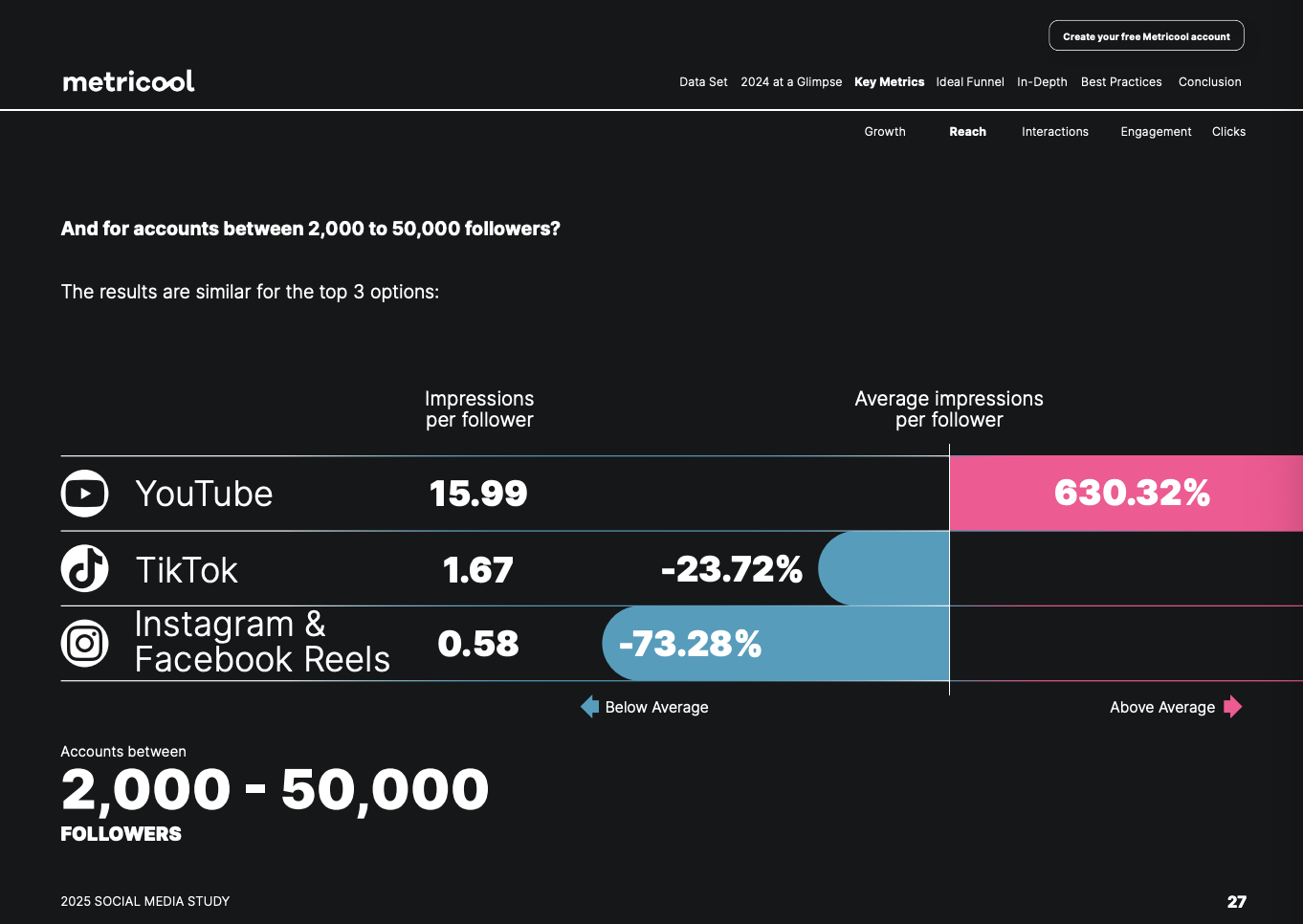 นอกจากนี้ยังมีการวิเคราะห์เพิ่มเติมด้วยว่า หากแอ็กเคานต์เหล่านั้นมีจำนวนผู้ติดตามที่แตกต่างกัน แพลตฟอร์มไหนจะเอื้อต่อการพัฒนาคอนเทนต์ และสร้างคอมมูนิตี้ให้เติบโตด้วยยอด Impressions ได้มากที่สุด ซึ่งสามารถอิงตามตัวเลขของจำนวนผู้ติดตามได้ ดังนี้