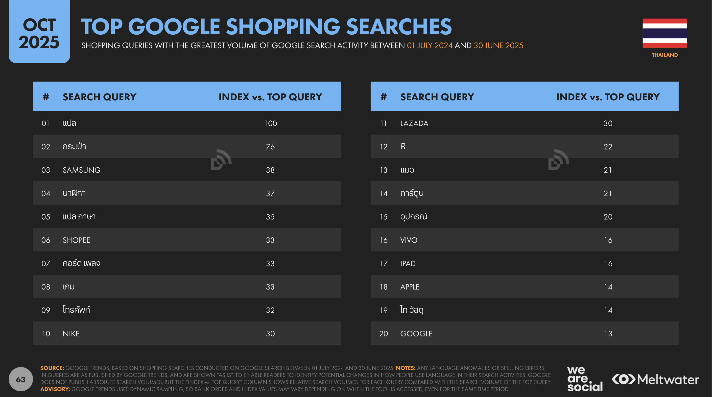 สำหรับ Volume ในการเสิร์ชเพื่อบน Google ของประเทศไทย ส่วนใหญ่ไม่ได้เสิร์ชเพื่อค้นหาสินค้าหรือทำความรู้จักแบรนด์หรือช่องอื่น ๆ แล้ว แต่เป็นการแปลภาษาโดยใช้ Google Translate แบบเร็ว ๆ มากกว่า รองลงมาก็จะเป็นสินค้าเพื่อชอปปิงและเทคโนโลยี หรือเนื้อเพลงและคอร์ดเพลงในการนำไปเล่นได้อยู่