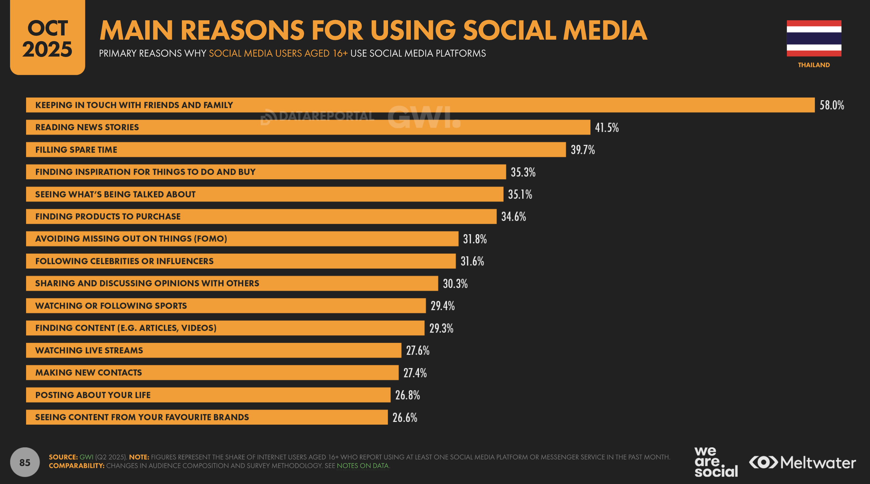 การใช้งานโซเชียลมีเดียผู้คนในประเทศไทยก็ยังคงใช้เพื่อเป็นช่องทางติดต่อกับเพื่อนและครอบครัว รองลงมาก็เพื่ออ่านและตามข่าว ตามมาด้วยใช้ในเวลาว่าง ไปจนถึงการหาแรงบันดาลใจและหาสิ่งที่อยากทำหรืออยากซื้อต่อไป