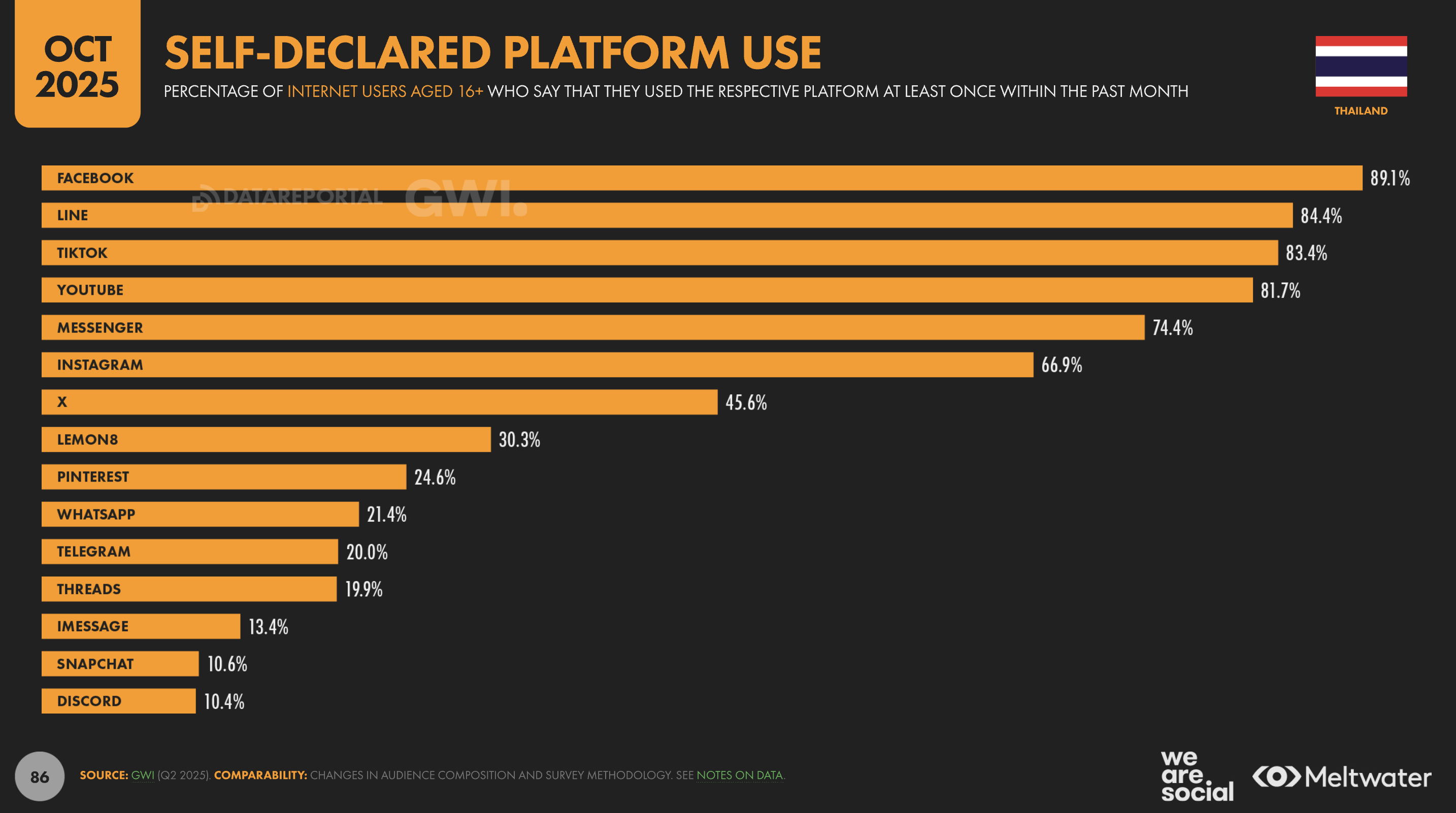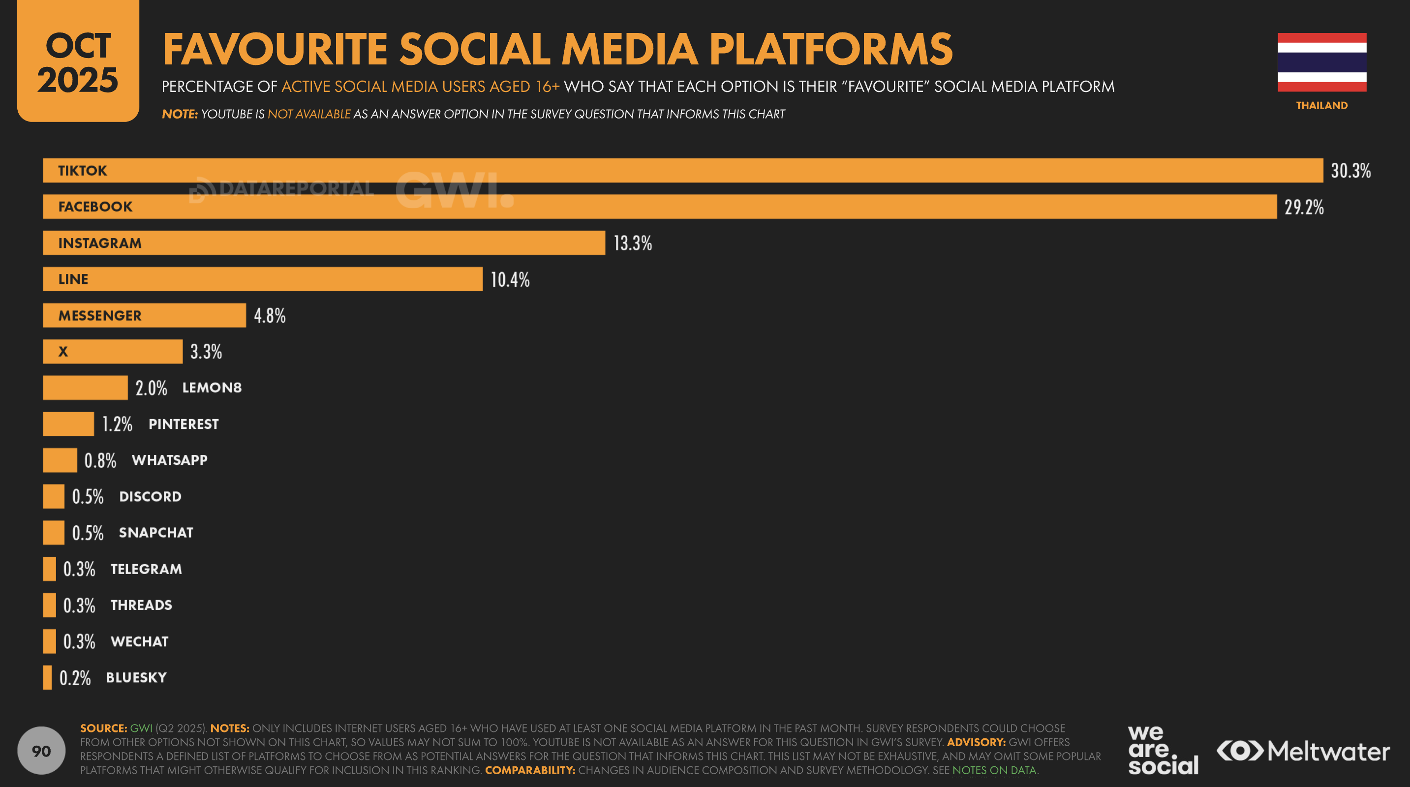 แพลตฟอร์มยอดนิยมสำหรับผู้ใช้ในไทยยังคงมี TikTok เป็นอันดับหนึ่งที่ 30.3% เพราะผู้คนชอบไถคลิปแนวตั้งดูในชีวิตประจำวัน ตามมาด้วยแพลตฟอร์มที่ทุกคนต้องมีอย่าง Facebook ที่ 29.2% และแพลตฟอร์มโชว์ไลฟ์สไตล์ผ่านสตอรีได้แบบ Instagram ส่วนอันดับที่รองลงมาก็คือ LINE, Messenger และ X ที่คนไทยใช้กันบ่อย