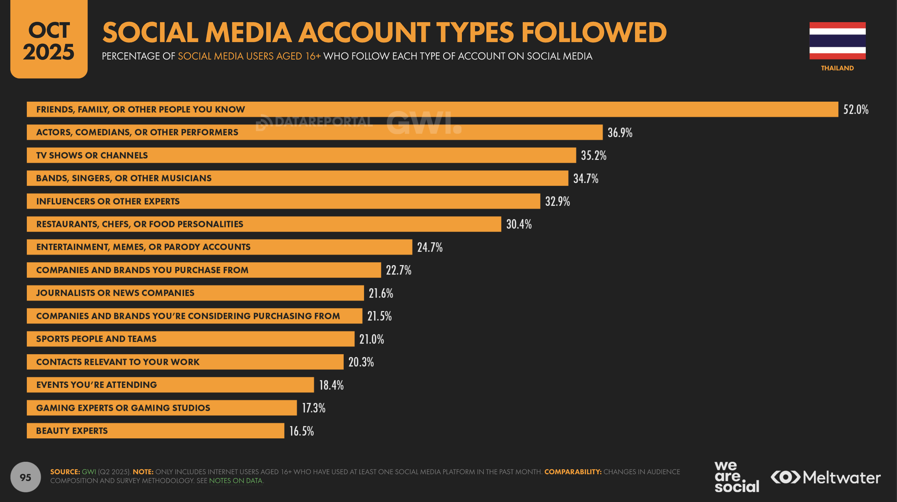 แอ็กเคานต์โซเชียลมีเดียที่คนไทยมักจะกดติดตาม อันดับแรกก็คือแอ็กเคานต์ของเพื่อน หรือครอบครับ และคนรู้จักที่ 52.0% ตามมาด้วยบุคคลชื่อเสียงที่ชอบ 36.9% และช่องที่ติดตาม 35.2% กับ 34.7% หรืออินฟลูเอนเซอร์ต่าง ๆ ที่ 32.9% ซึ่งแสดงให้เห็นว่าโซเชียลมีเดียยังคงเป็นพื้นที่ที่ใช้ติดต่อและติดตามคนรู้จักอยู่