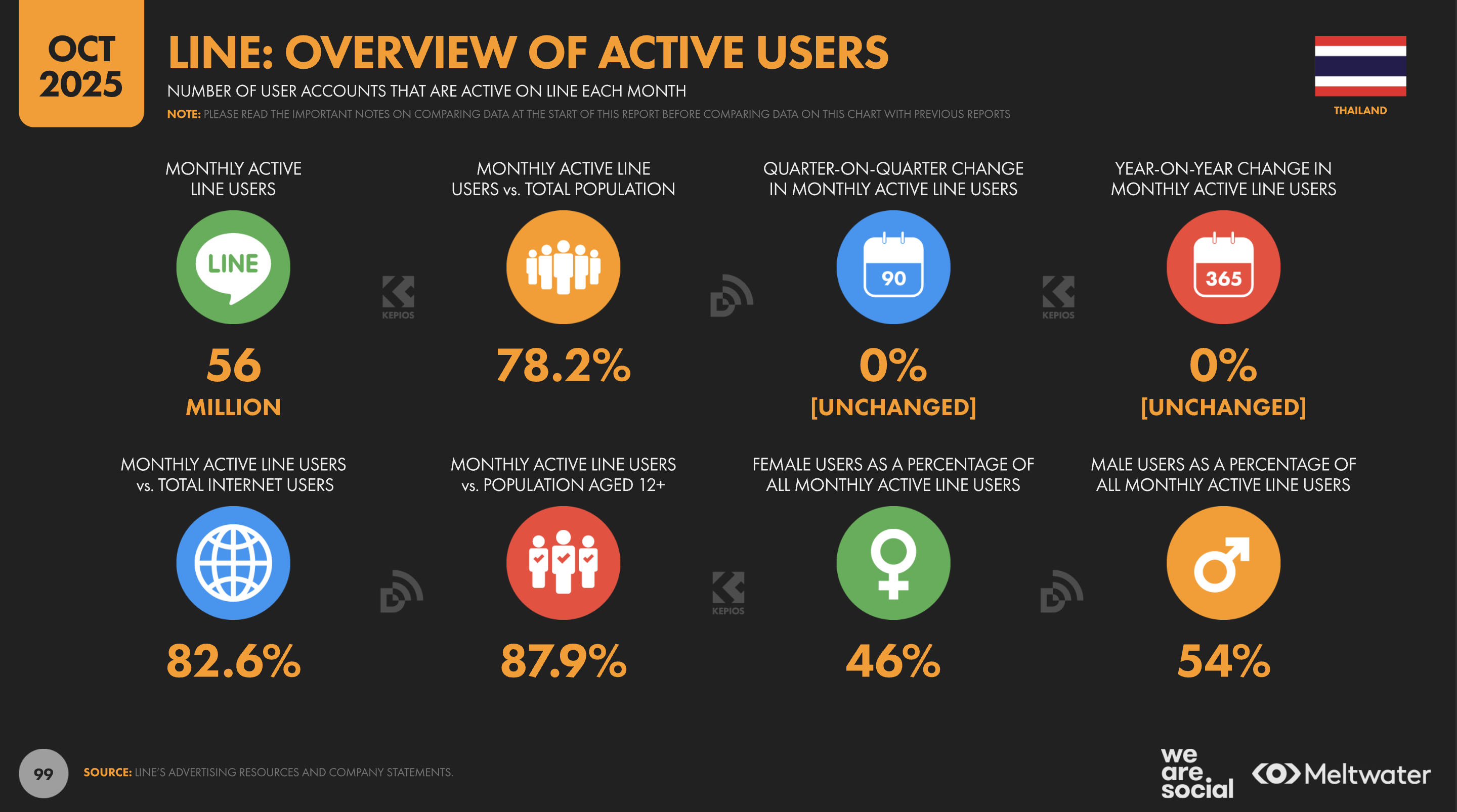 หากคนไทยใช้อินเทอร์เน็ตที่ 67.8 ล้านคน ก็มีการใช้ LINE ในการติดต่อสื่อสารมากถึง 56 ล้านคนที่เกินครึ่ง โดยสัดส่วนที่เทียบกับคนไทยทั้งหมดได้ 78.2% และเทียบกับผู้ใช้อินเทอร์เน็ตอยู่ที่ 82.6% ซึ่งมีผู้ใช้ที่เป็นผู้หญิง 54% และผู้ใช้ผู้ชายที่ 46%