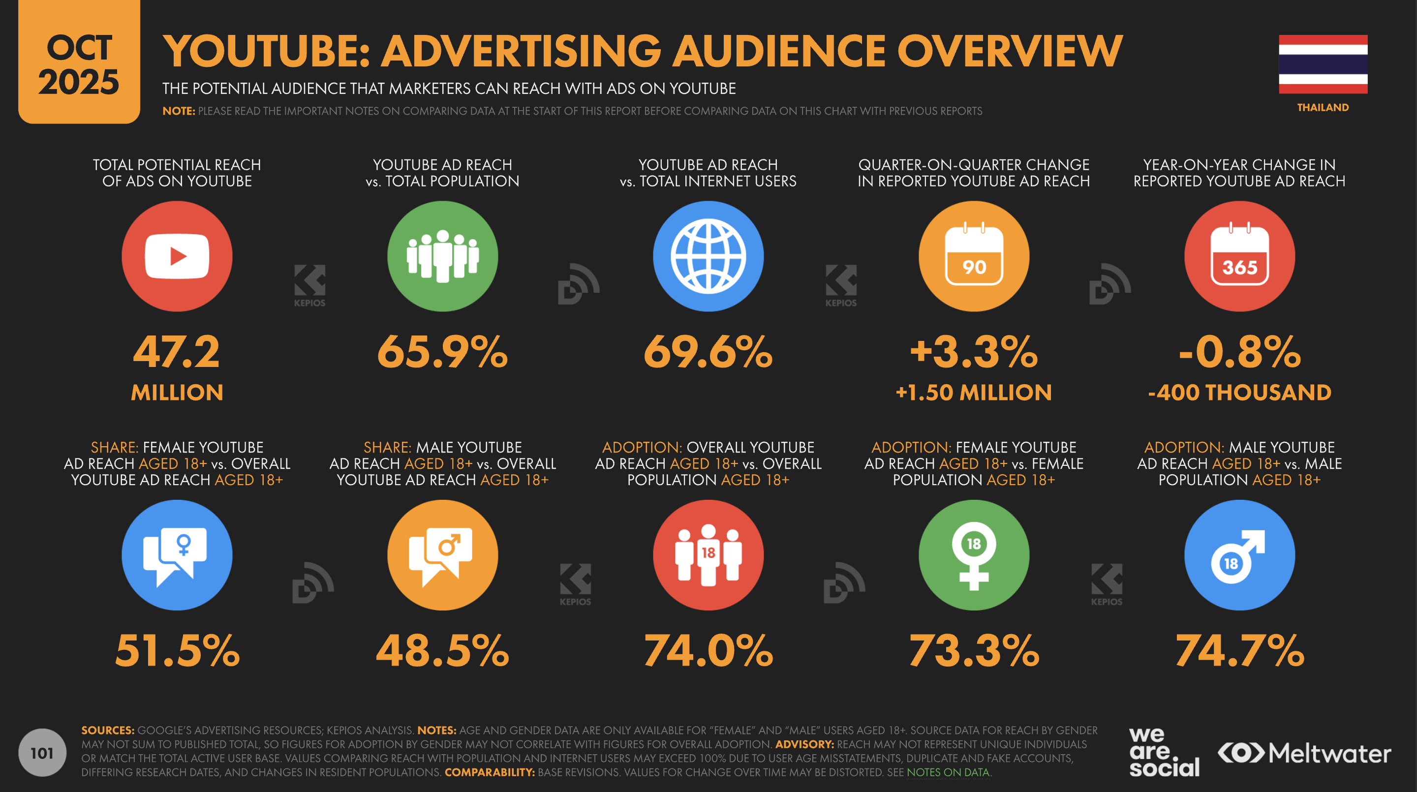 สำหรับภาพรวมของ YouTube มียอด Reach ในการเข้าถึงโฆษณามากถึง 47.2 ล้านจากประชาชน 65.9% เมื่อเทียบกับจำนวนคนในประเทศไทยทั้งหมด ซึ่งคิดเป็นสัดส่วนของผู้ชายที่ 73.3% และผู้หญิงที่ 74.7% สำหรับทุกคนที่อายุ 18 ปีขึ้นไป นอกจากนี้ยอด Ad Reach ยังเพิ่มขึ้นในเดือนตุลาคมมากถึง +3.3% ที่ 47.2 ล้านด้วย