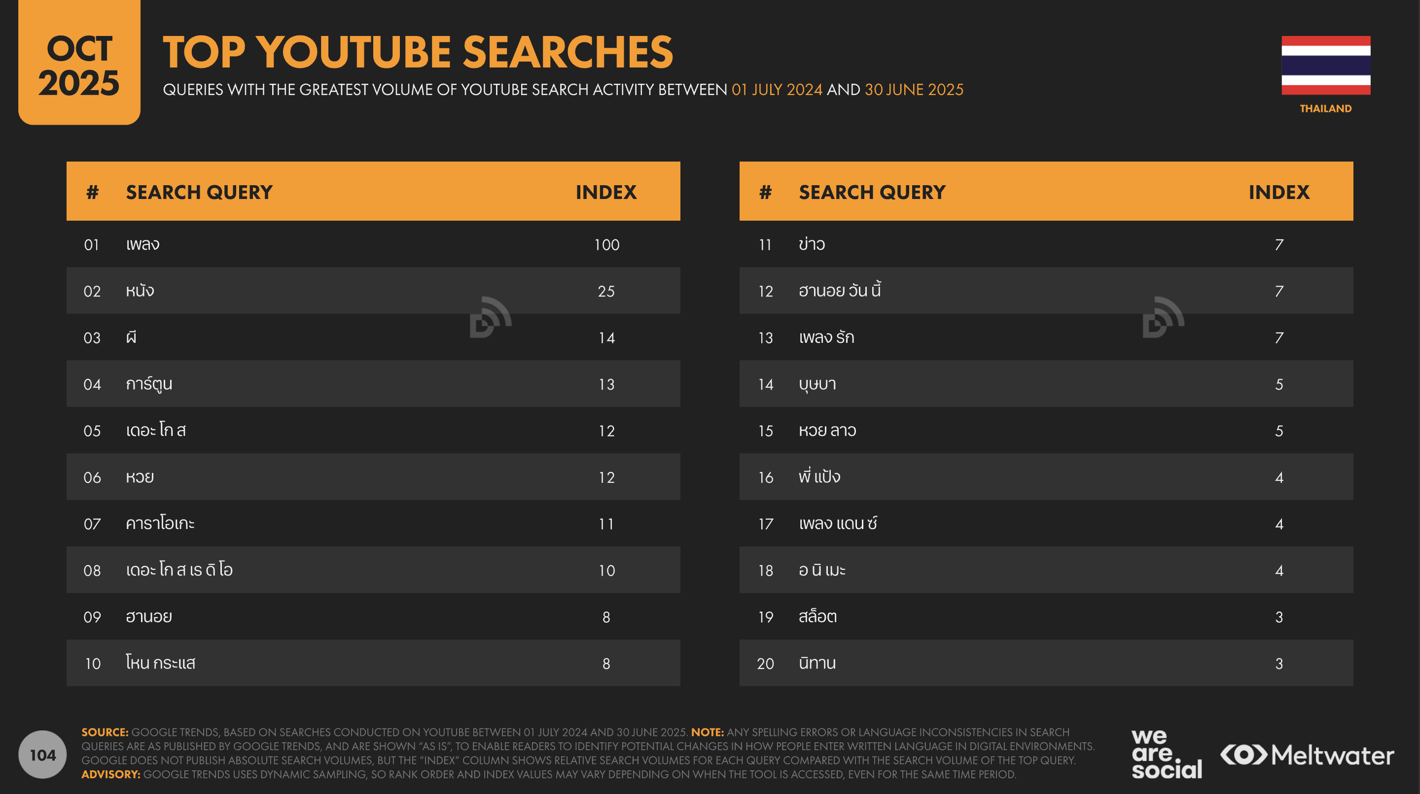 ด้าน Top YouTube Searches ที่คนไทยนิยมค้นหาอันดับ 1 คือ ‘เพลง’ ตามมาด้วย ‘หนัง’ และ ‘ผี’ เป็นอันดับ 2 และ 3 นอกจากนี้ยังมีหมวดที่เชื่อมโยงถึงความสนใจในหมวดเดียวกัน นั่นก็คือ ‘การ์ตูน’, ‘เดอะ โกส’ และ ‘คาราโอเกะ’ ไปจนถึง ‘หวย’ ด้วย ซึ่งยังคงบ่งบอกถึงความเป็นคนไทยได้เป็นอย่างดี
