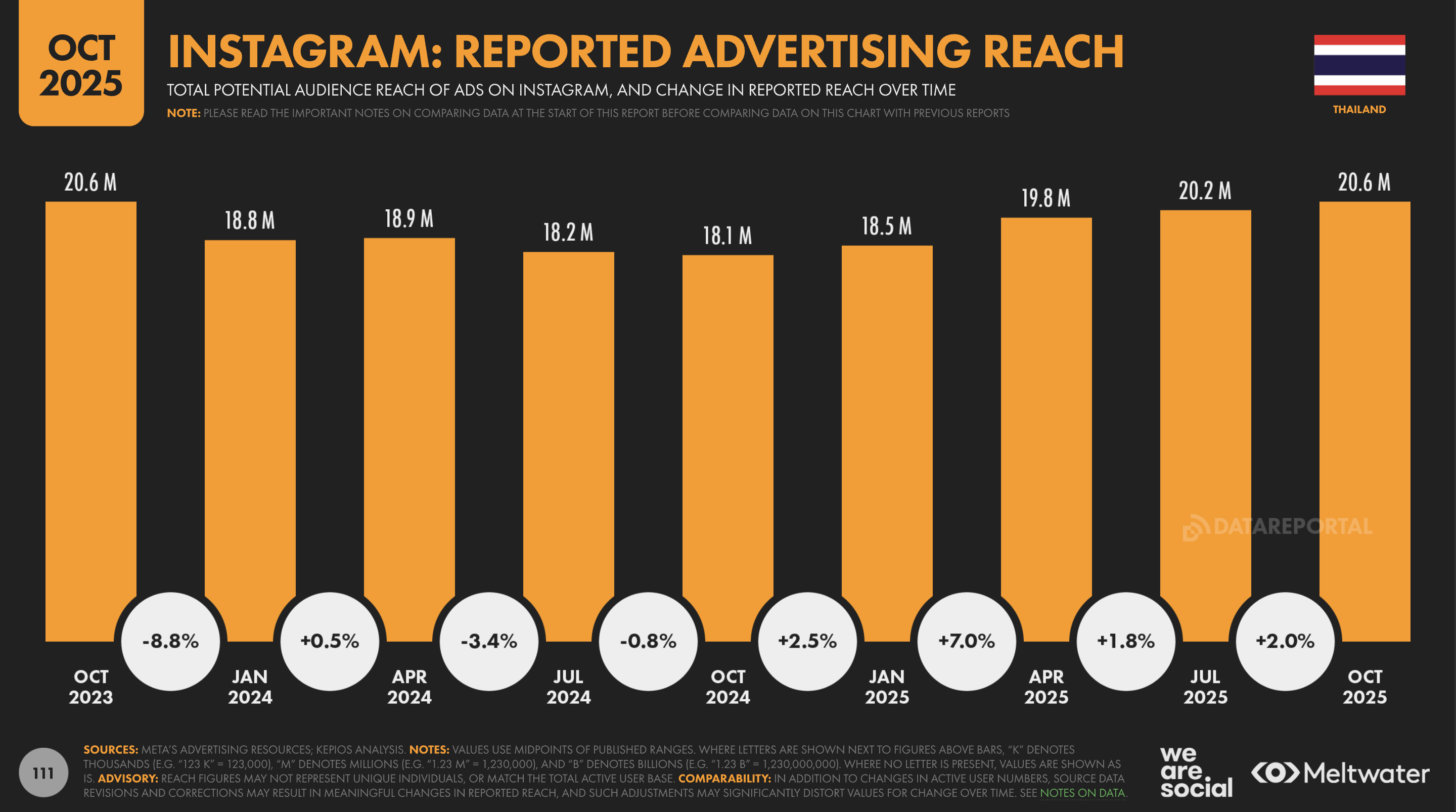การเข้าถึงโฆษณาบน Instagram ก็จะมียอด Reach ทั้งหมด 20.6 ล้าน โดยเทียบกับคนไทยทั้งหมดได้ที่ 28.7% ในการเสพโฆษณาบนแพลตฟอร์มนี้ คิดเป็นสัดส่วนผู้ชายที่ 37.5% และผู้หญิงที่ 29.8% ซึ่งในเดือนตุลาคมมียอด Reach เพิ่มขึ้นเป็น +2.0% หรือคิดเป็น 20.6 ล้านเลยทีเดียว