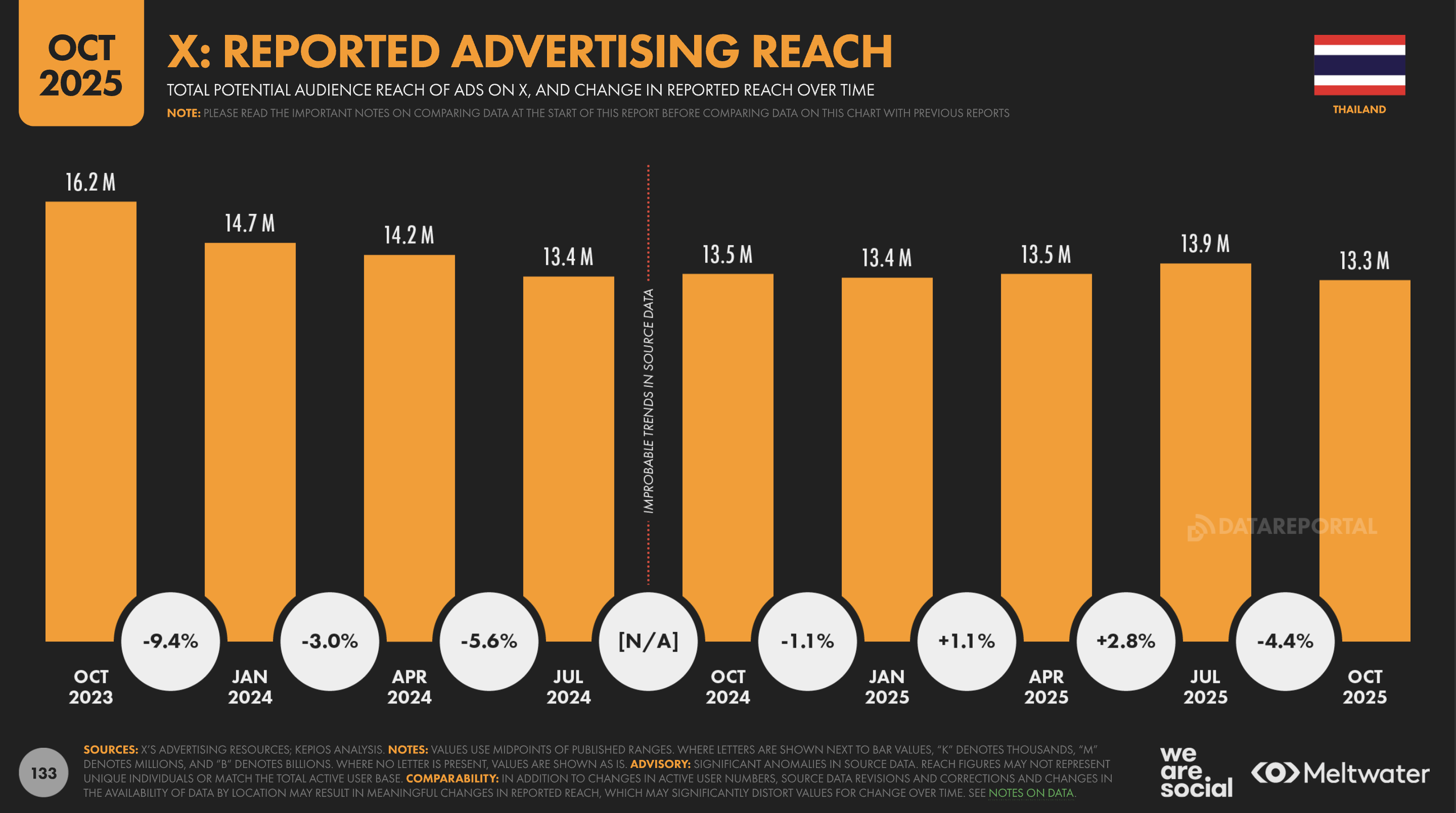 การเข้าถึงโฆษณาบน X อยู่ที่ 13.3 ล้านเมื่อเทียบกับจำนวนคนไทยทั้งหมดได้ 18.6% โดยคิดสัดส่วนเป็นผู้ชาย 17.1% และผู้หญิง 25.7% ซึ่งค่าเฉลี่ยของยอด Reach ลดลง -4.4% ในเดือนตุลาคมที่ผ่านมา หรือคิดเป็น 13.3 ล้านด้วย