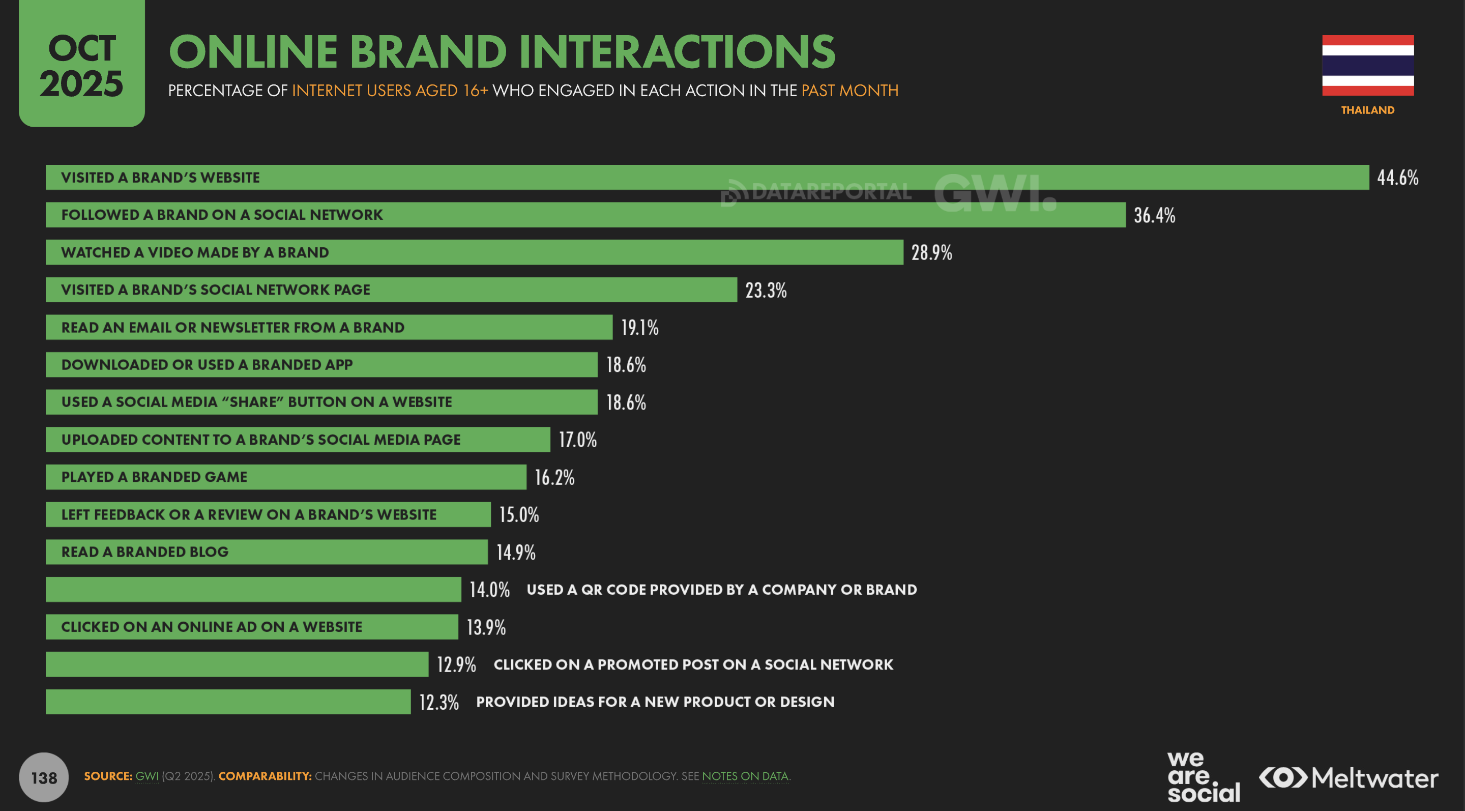 สำหรับการมีส่วนร่วมกับแบรนด์แบบออนไลน์ส่วนใหญ่ของคนไทย อันดับ 1 จะชอบเข้าไปท่องเว็บไซต์ของแบรนด์กว่า 44.6% ตามมาด้วยการกดติดตามแอ็กเคานต์ของแบรนด์ในโซเชียลมีเดีย 36.4% และรับชมวิดีโอจากแบรนด์ 28.9% ตามมาด้วยการมีส่วนร่วมกับแบรนด์ด้วยวิธีอื่น ๆ เช่น การอ่านอีเมล หรือกดแชร์ และให้ฟีดแบ็กกับแบรนด์