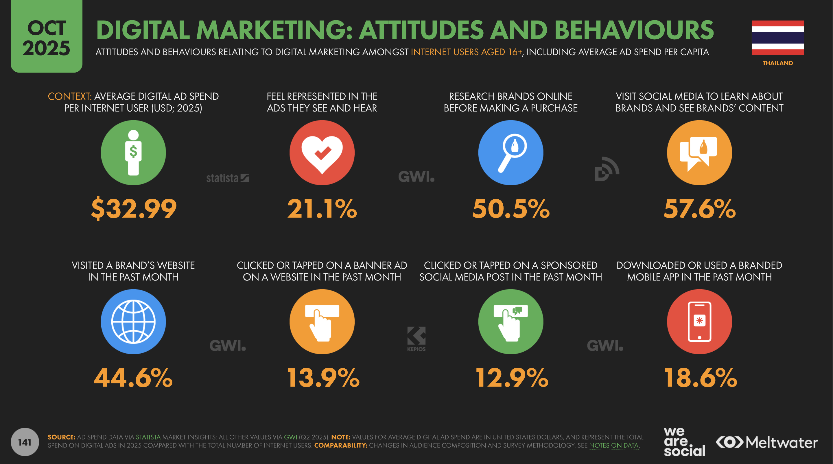 สำหรับทัศนคติและพฤติกรรมของคนไทยต่อแบรนด์ จะให้ความสนใจกับแบรนด์ที่พูดแทนถึงตัวตน สังคม หรือความรู้สึกที่เป็นไปตามค่านิยมของแต่ละกลุ่มได้ 21.1% รวมถึงมีการรีเสิร์ชแบรนด์ออนไลน์ก่อนที่จะตัดสินใจซื้ออย่างละเอียด 50.5% รวมถึงมีการเข้าไปเยี่ยมชมแอ็กเคานต์ของแบรนด์เพื่อศึกษาตัวตนของแบรนด์ 57.6%