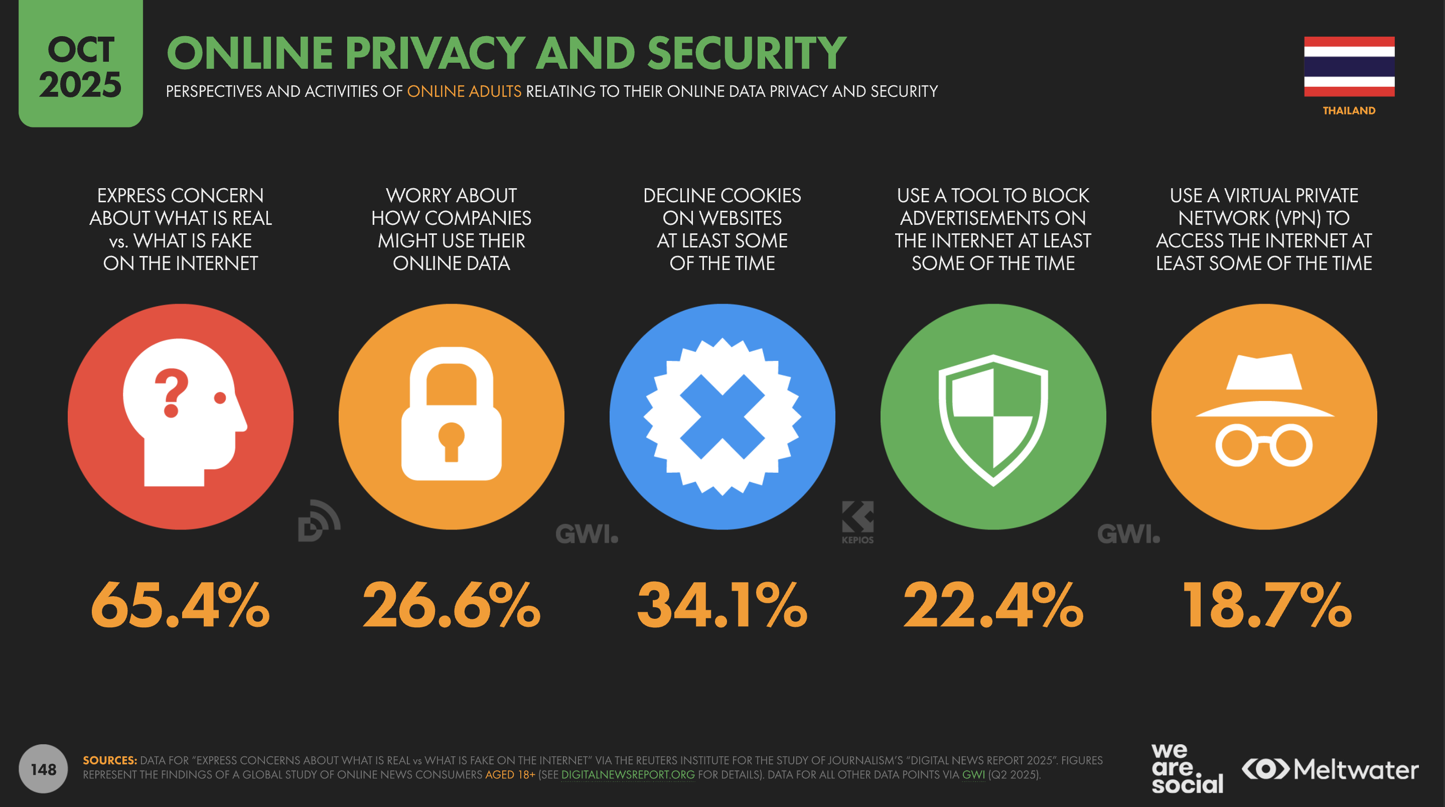 ในด้านความปลอดภัยและความเป็นส่วนตัวที่คนไทยยุคนี้กังวล ก็คือคือเรื่องการแยกแยะระหว่างข้อมูลจริงกว่า 65.4% เพราะมีข้อมูลปลอมที่บิดเบือนมาจากการสร้างข้อมูล ภาพ หรือวิดีโอด้วย AI ที่เริ่มเนียนขึ้นทุกวันจนแยกไม่ออกเยอะ สะท้อนถึงปัญหา Fake News และ Misinformation เยอะขึ้นในโลกโซเชียลและอินเทอร์เน็ต