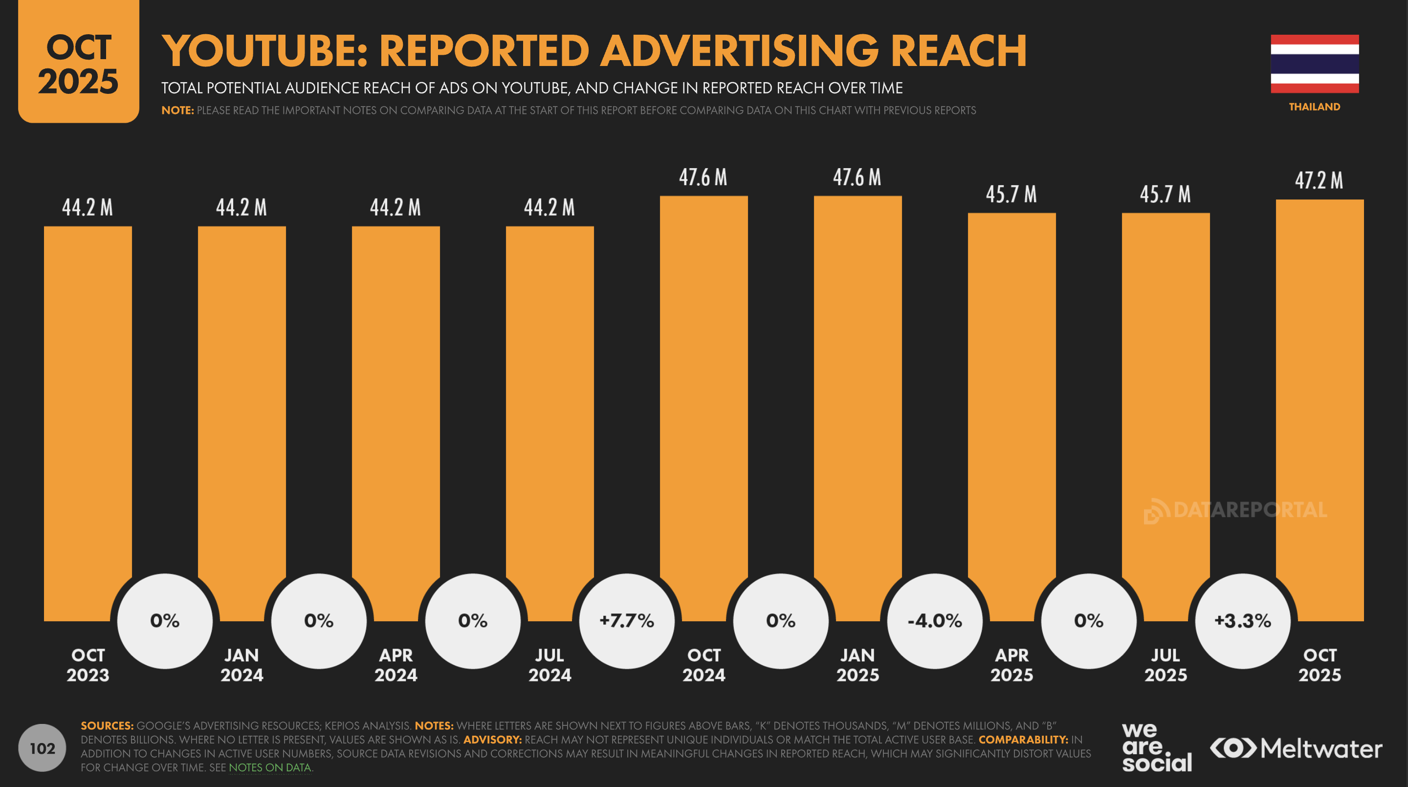 สำหรับภาพรวมของ YouTube มียอด Reach ในการเข้าถึงโฆษณามากถึง 47.2 ล้านจากประชาชน 65.9% เมื่อเทียบกับจำนวนคนในประเทศไทยทั้งหมด ซึ่งคิดเป็นสัดส่วนของผู้ชายที่ 73.3% และผู้หญิงที่ 74.7% สำหรับทุกคนที่อายุ 18 ปีขึ้นไป นอกจากนี้ยอด Ad Reach ยังเพิ่มขึ้นในเดือนตุลาคมมากถึง +3.3% ที่ 47.2 ล้านด้วย