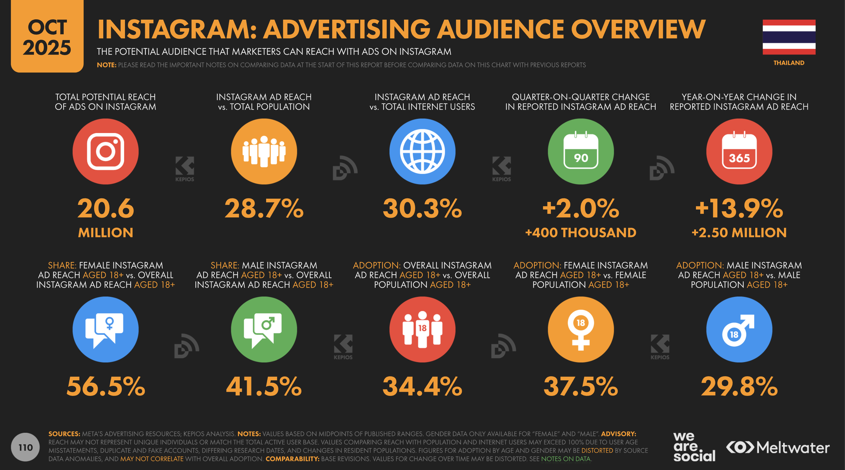 การเข้าถึงโฆษณาบน Instagram ก็จะมียอด Reach ทั้งหมด 20.6 ล้าน โดยเทียบกับคนไทยทั้งหมดได้ที่ 28.7% ในการเสพโฆษณาบนแพลตฟอร์มนี้ คิดเป็นสัดส่วนผู้ชายที่ 37.5% และผู้หญิงที่ 29.8% ซึ่งในเดือนตุลาคมมียอด Reach เพิ่มขึ้นเป็น +2.0% หรือคิดเป็น 20.6 ล้านเลยทีเดียว