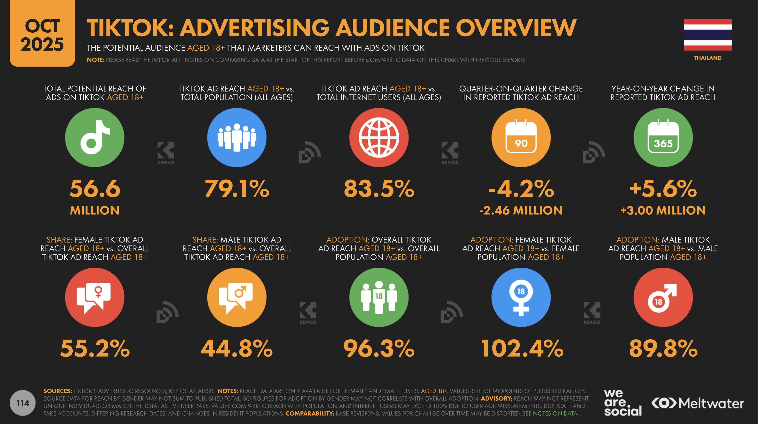 ด้านยอด Reach ของ TikTok ในการเข้าถึงโฆษณาจะอยู่ที่ 56.6 ล้าน ซึ่งเทียบกับคนไทยทั้งหมดอยู่ที่ประมาณ 79.1% ซึ่งมีสัดส่วนผู้ชายที่ 102.4% และผู้หญิงที่ 89.8% โดยจะมียอด Reach น้อยลงที่ -4.2% หรือคิดเป็น 56.6 ล้านนั่นเอง