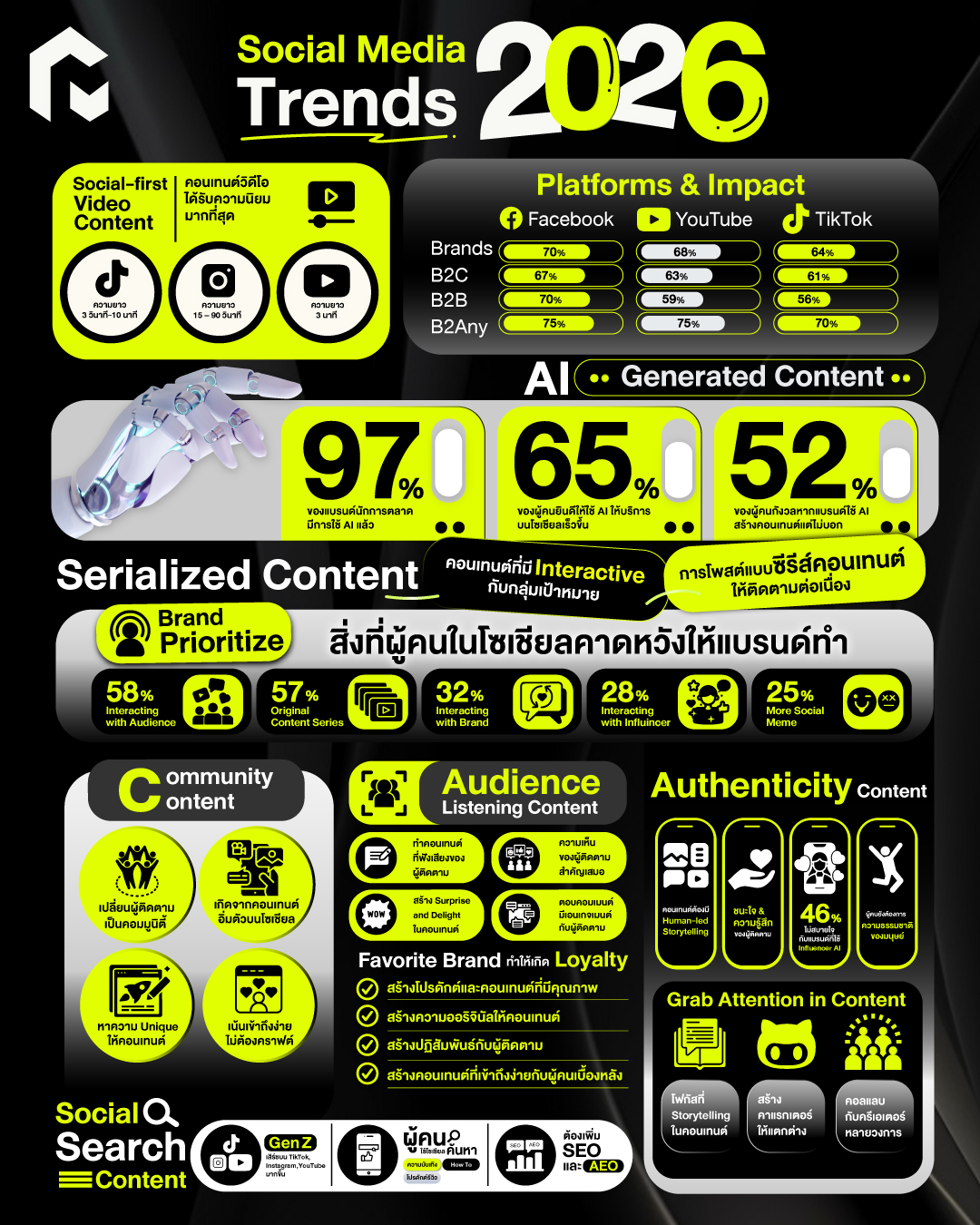 จาก ‘Content is King’ ก็กลายมาเป็น ‘Video is King’ ได้ในเวลาไม่กี่ปี แต่แน่นอนว่าการเข้ามาของ AI ก็เริ่มส่งผลถึงการใช้ชีวิตประจำวันเช่นกัน เพราะผู้คนเข้าถึงการใช้ AI และแชตบอทง่ายขึ้น เลยอาจเร่ิมมีการเปลี่ยนแปลงอีกในปีหน้า เพราะในปีนี้โลกของ Social Media Trends 2026 ก็พลิกผันไม่น้อยเลยทีเดียว
