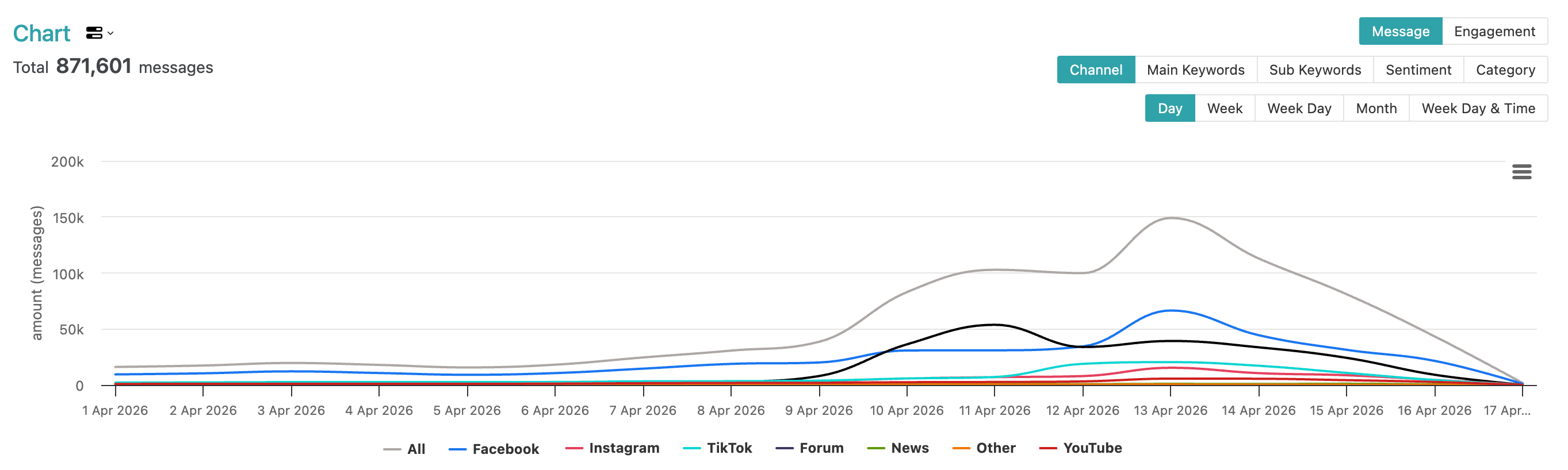 ขณะเดียวกันสงกรานต์บนโลกออนไลน์ ก็ยังคงร้อนแรงไม่แพ้บรรยากาศบนท้องถนน โดยข้อมูลจาก บริษัท Wisesight (ประเทศไทย) ได้ทำการเก็บข้อมูลที่เกี่ยวข้องผ่านเครื่องมือ Zocial Eye ที่เก็บข้อมูลบนโลกออนไลน์ตลอดในช่วงวันที่ 1-17 เมษายน 2569 พบว่า มีการพูดถึงสงกรานต์มากถึง 871,601 ข้อความ และสร้างเอนเกจเมนต์รวมสูงถึง 424,598,759 ครั้ง สะท้อนให้เห็นว่านี่คือหนึ่งใน Moment ใหญ่ระดับชาติที่โซเชียลมีเดียให้ความสนใจอย่างต่อเนื่องทุกปี