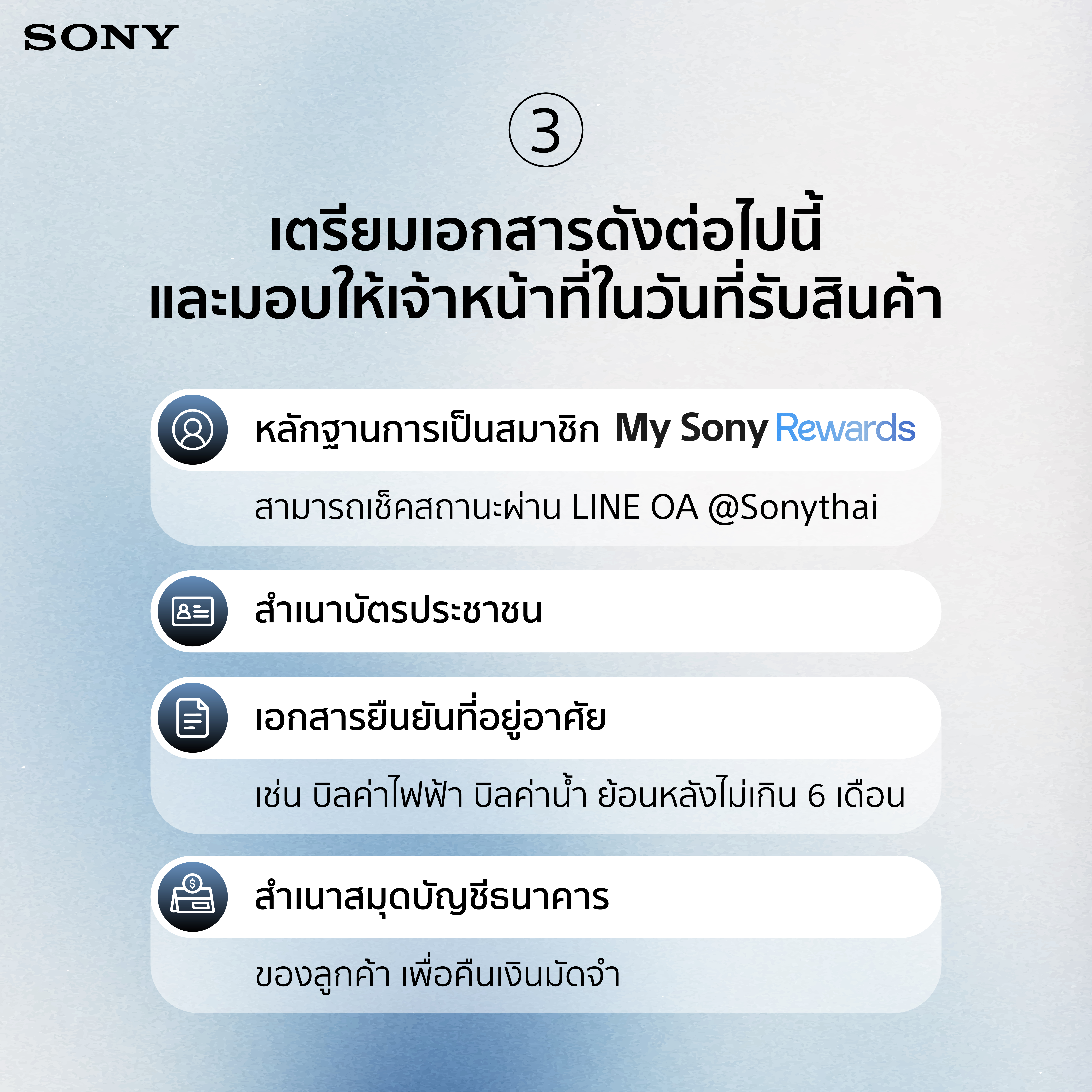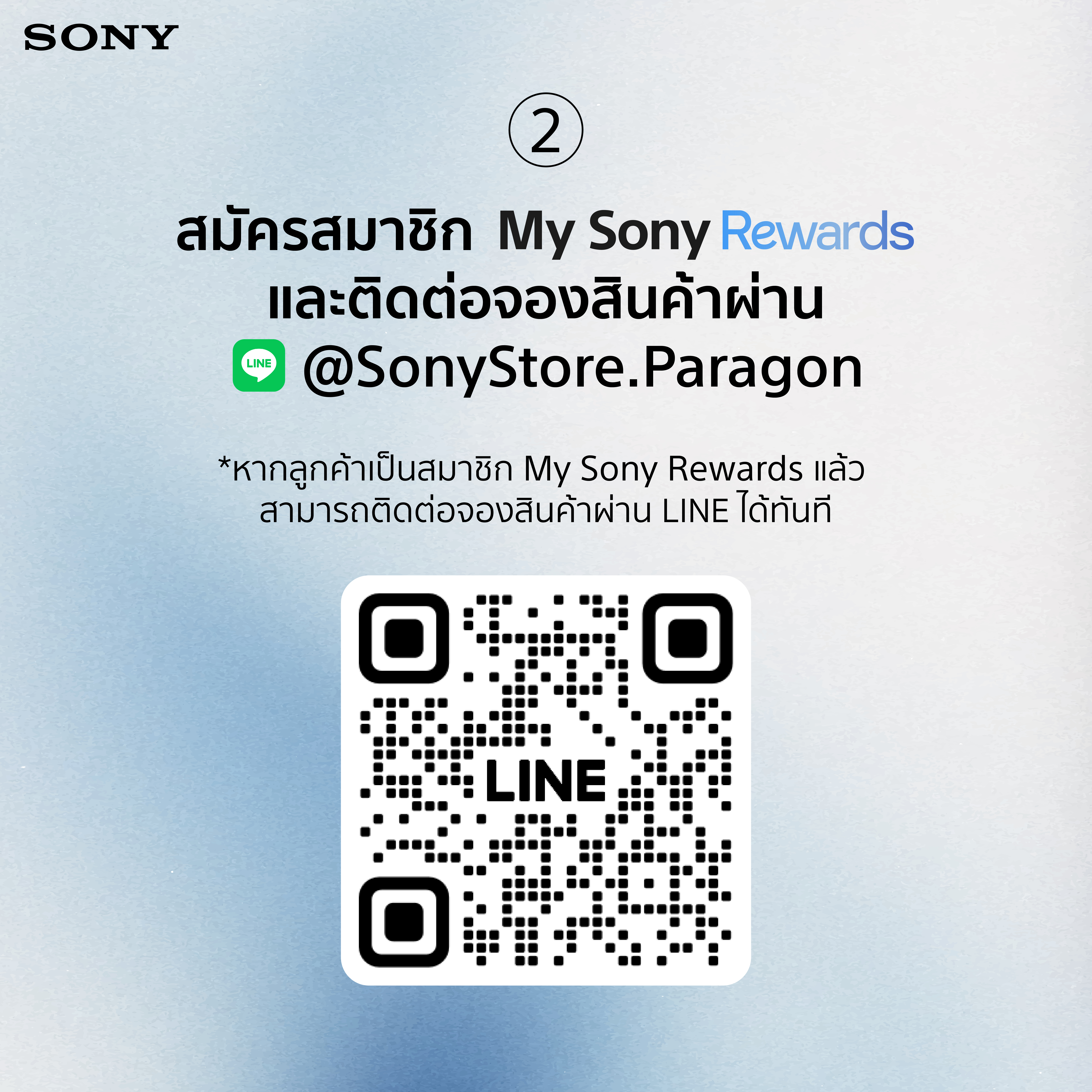 2. สมัครสมาชิก My Sony Rewards ผ่านช่องทาง https://page.line.me/zce8506f?oat_content=url&openQrModal=true แต่หากเป็นสมาชิกอยู่แล้วก็สามารถข้ามขั้นตอนนี้ได้เลย