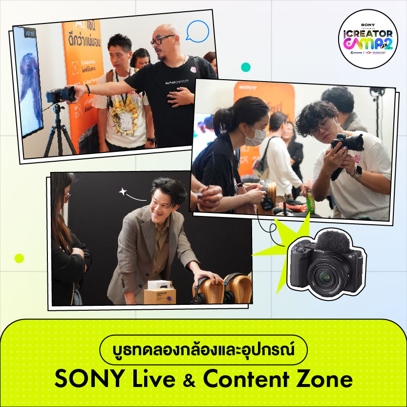 นอกจากได้เรียนรู้ทักษะเกี่ยวกับการทำคอนเทนต์แล้ว ภายในแคมป์ยังมีกิจกรรมมากมาย ไม่ว่าจะเป็น กิจกรรม Ice Breaking หรือบูธกิจกรรม ซึ่งปีนี้ SONY ก็ได้ยกบูธมาไว้หน้างานถึง 2 โซน ทั้ง “SONY Live & Content Zone” ที่เปิดพื้นที่ให้เหล่าครีเอเตอร์ทดลองเซ็ตอัปกล้องสำหรับการ Live รวมถึงเข้ามาเล่น เรียนรู้การถ่ายวิดีโอด้วยกล้อง ZV-E10 II และ Alpha 7C II ที่โดดเด่นเรื่องภาพสวยสดใส เพื่อยกระดับคอนเทนต์ให้มีคุณภาพจนสามารถช่วยกระตุ้นยอดเอนเกจเมนต์ได้