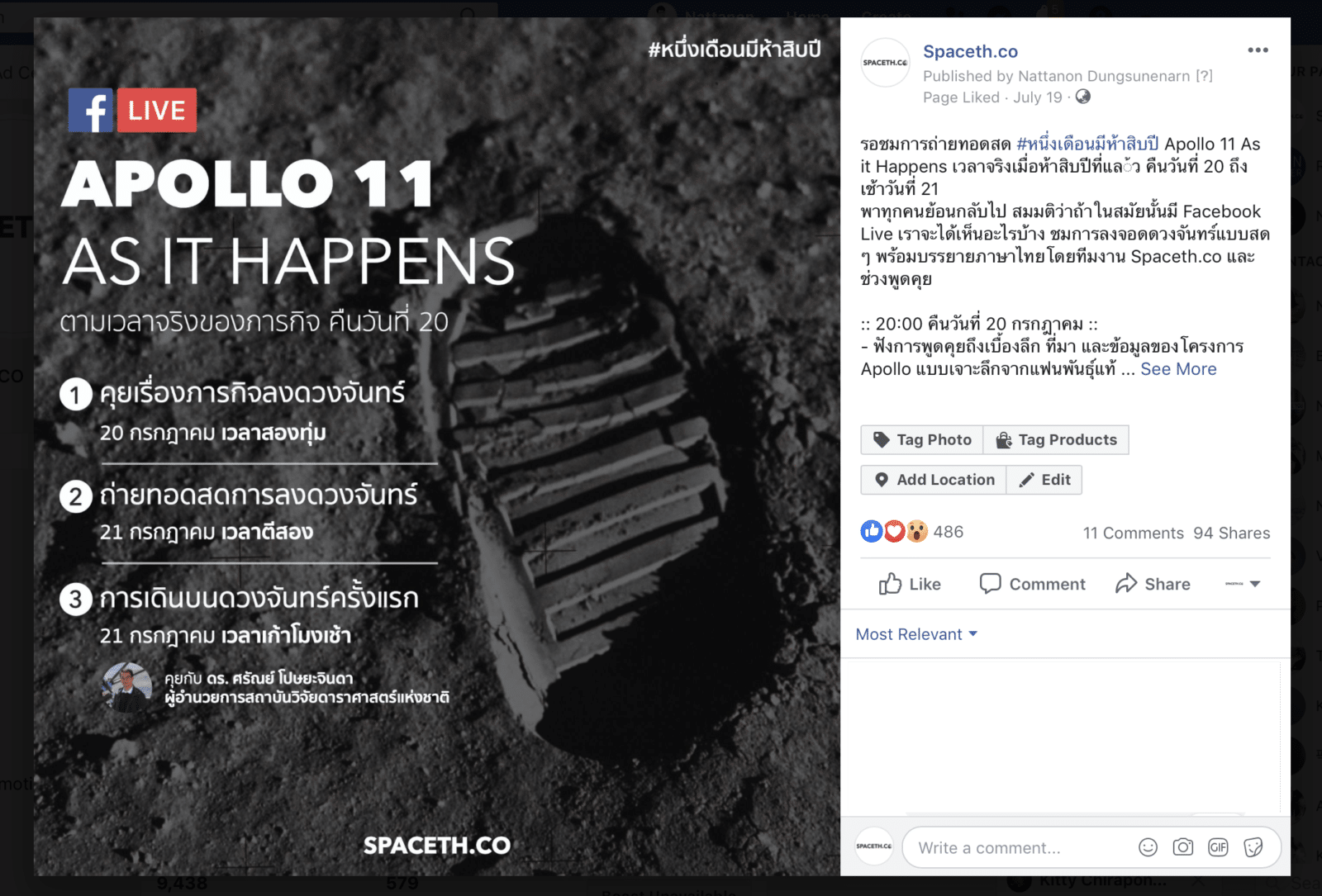 นอกจาก RAiNMAKER แล้วอีกหนึ่งบทบาทของผู้เขียนก็คือการเป็นบรรณาธิการบริหารของเว็บอวกาศชื่อ Spaceth.co ซึ่งโจทย์ของเดือนนี้ก็คือ เป็นเดือนครบรอบ 50 ปี การลงจอดดวงจันทร์ของโครงการ Apollo 11 ดังนั้นจึงจำเป็นต้องมีคอนเทนต์อะไรที่พิเศษกว่าบทความหรือภาพชุด หลังจากที่คุยกันในทีมก็ปรากฏว่าลงความเห็นกันว่าจะทำคอนเทนต์ Live แบบ 12 ชั่วโมง ตั้งแต่ตอนที่ยาน Apollo ลงจอดบนดวงจันทร์จนถึงตอนที่นักบินอวกาศ Niel Armstrong ลงมาเหยียบดวงจันทร์ตามเวลาจริง ๆ ของภารกิจเมื่อ 50 ปีก่อน ซึ่งเป็นโจทย์ที่ท้าทายมาก ทั้งเรื่องการจัดการและเทคนิค