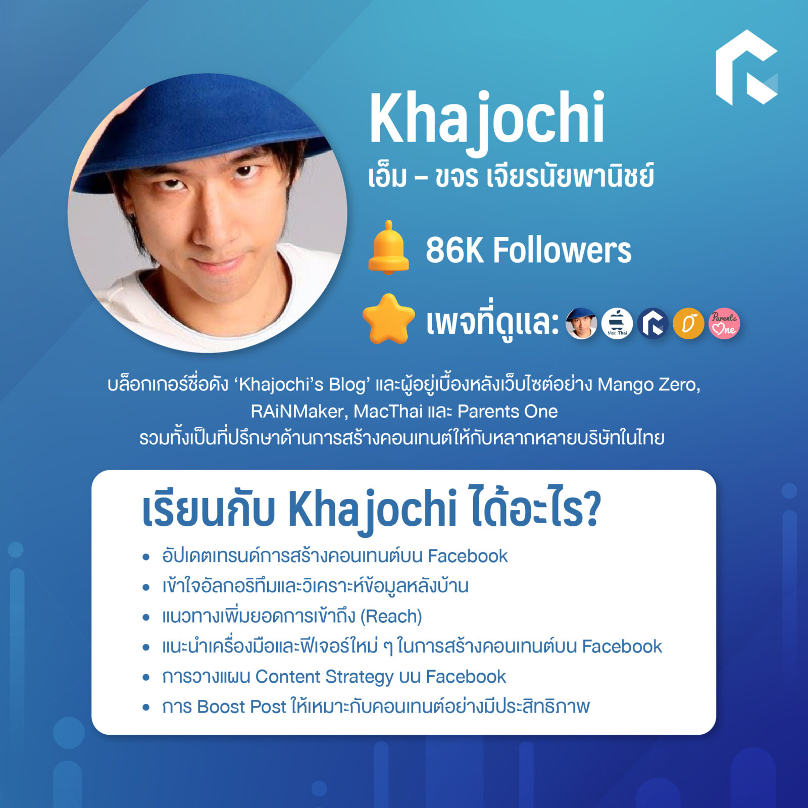 เอ็ม – ขจร เจียรนัยพานิชย์ บล็อกเกอร์ชื่อดัง ‘Khajochi’s Blog’ และผู้อยู่เบื้องหลังเว็บไซต์ชื่อดังของเมืองไทยอย่าง Mango Zero, RAiNMaker, MacThai และ Parents One รวมทั้งเป็นที่ปรึกษาด้านการสร้างคอนเทนต์ให้กับหลากหลายบริษัทในไทย