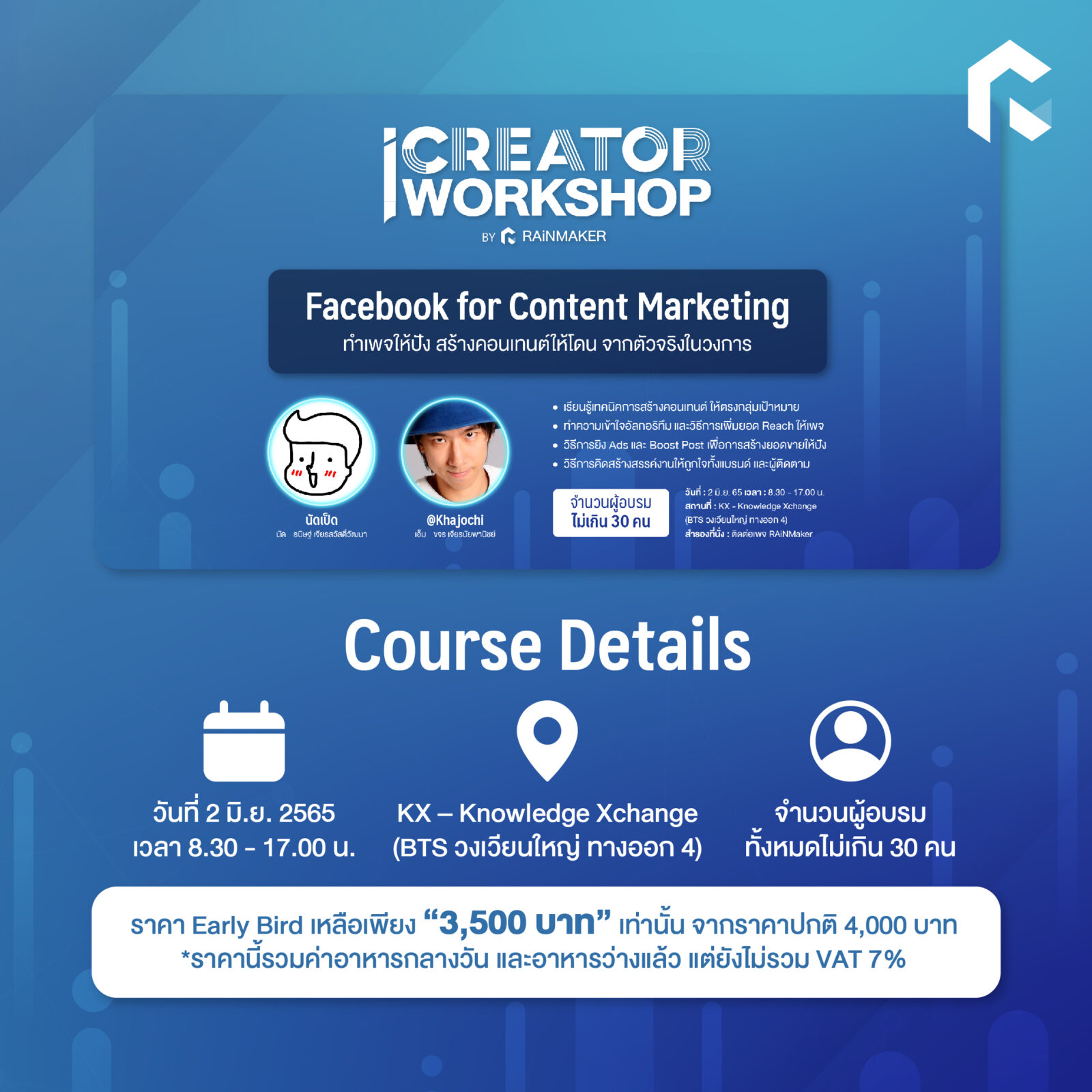 • ราคา Early Bird เหลือเพียง “3,500 บาท” เท่านั้น จากราคาปกติ 4,000 บาท (ยังไม่รวม VAT)