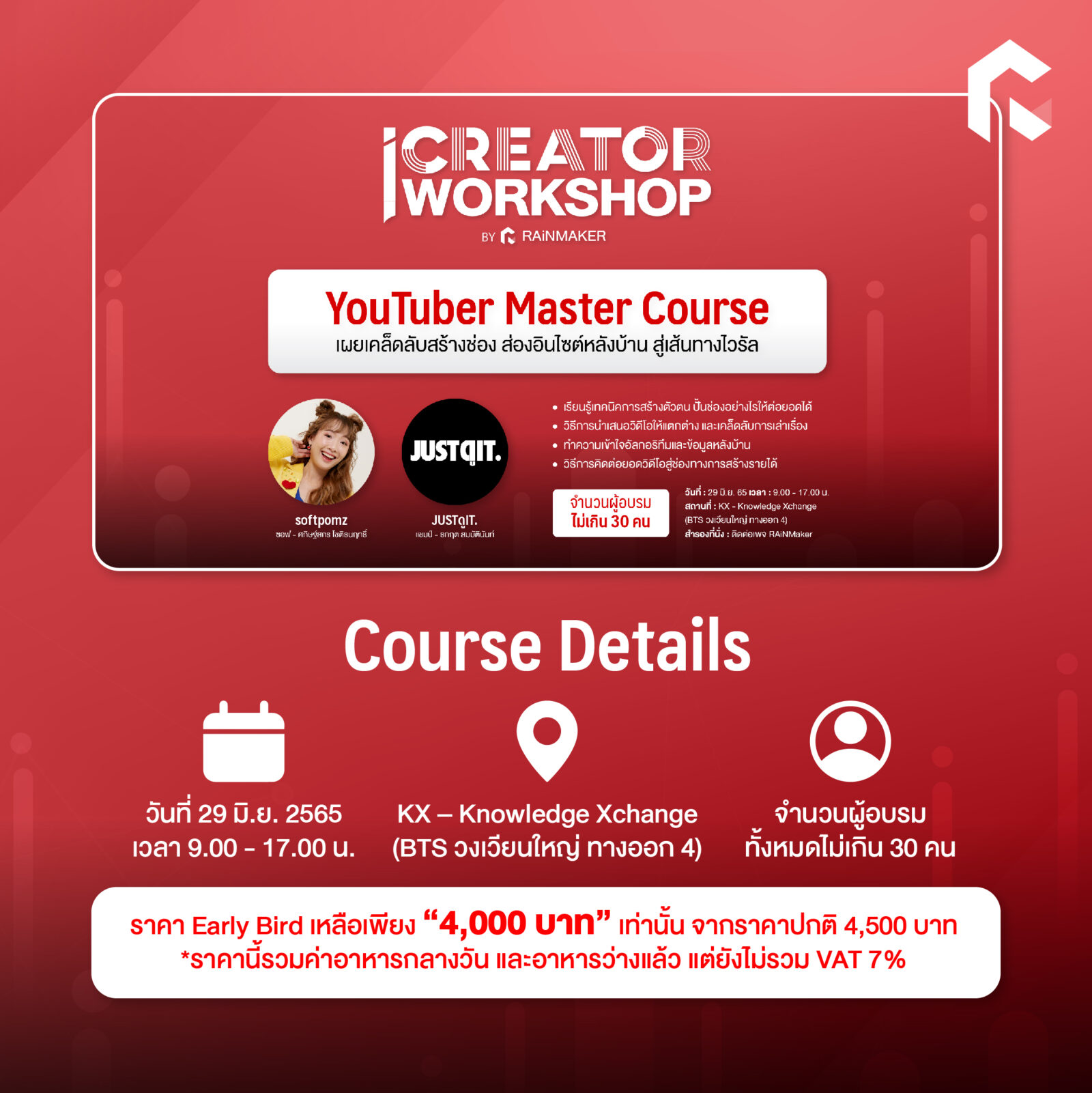- ราคา Early Bird เหลือเพียง “4,000 บาท” เท่านั้น จากราคาปกติ 4,500 บาท (ยังไม่รวม VAT)
