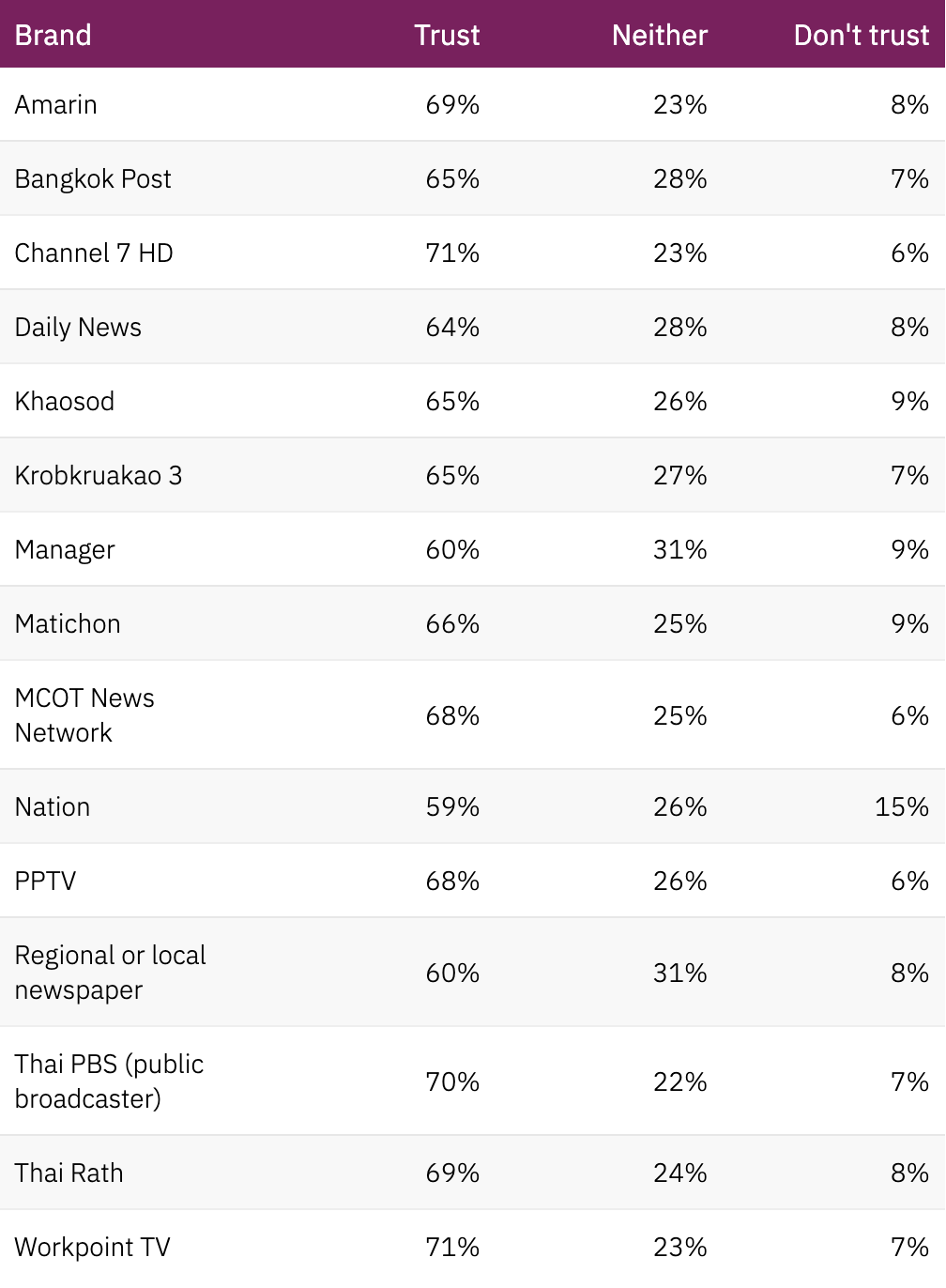 ซึ่งดูเหมือนว่า Channel 7 HD และ Thai PBS จะได้รับความน่าเชื่อถือมากที่สุดในกลุ่มสื่อจากโทรทัศน์