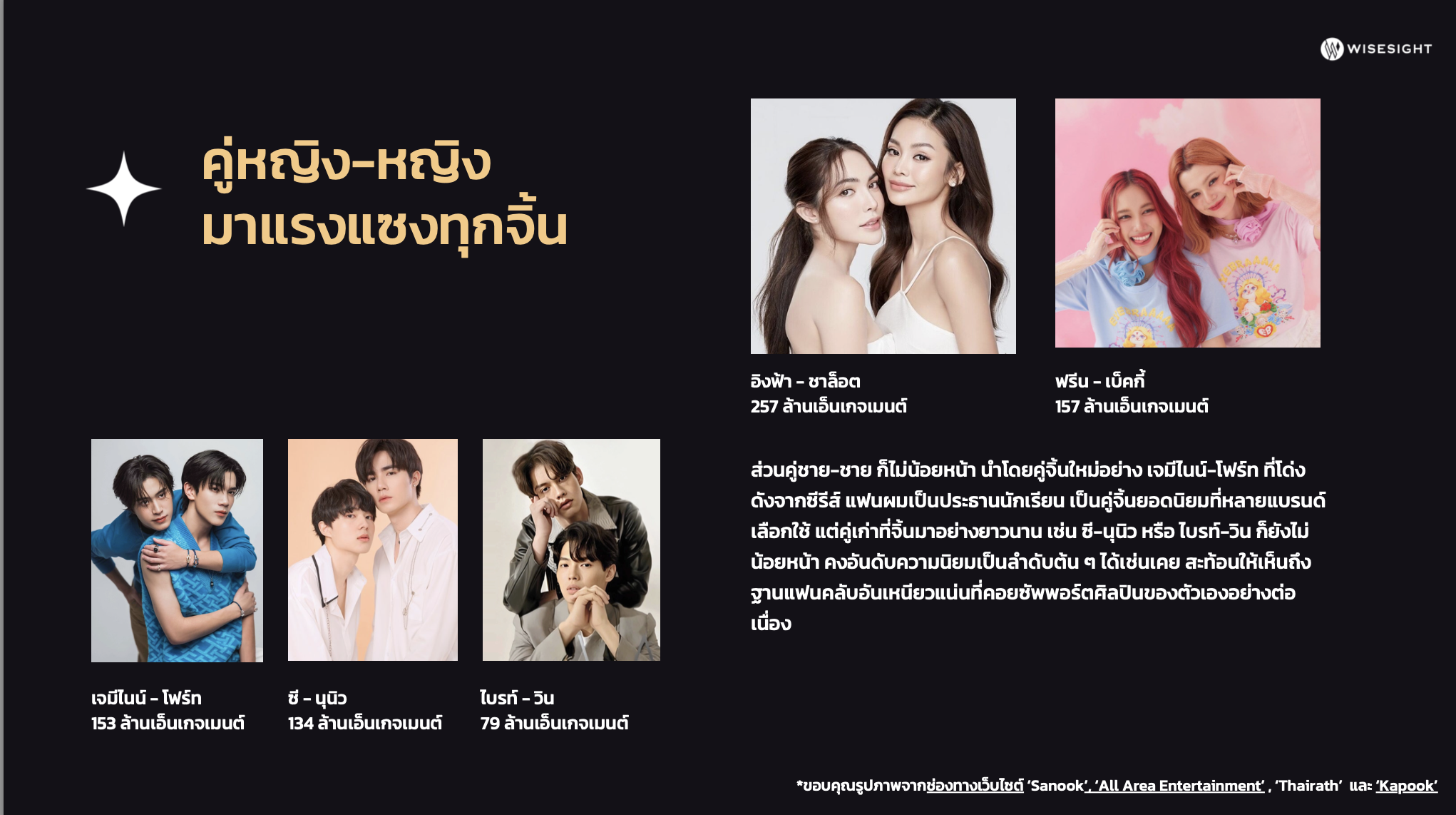 คุณธรรมพร พึ่งตัว Data Research Manager, Wisesight ได้เล่าถึงเคสการศึกษา Market Insight ที่เจอจากช่วง Q1-3 ปี 2566 ที่ผ่านมา ว่าศิลปินดาราในกลุ่ม “Boys’ Love/Girls’ Love” หรือ “คู่จิ้น” ชาย-ชายและหญิง-หญิง เป็นกลุ่มที่แบรนด์จากหลากหลาย Industry เลือกมาโปรโมตสินค้าและแคมเปญต่าง ๆ จนเกิดการพูดถึงกว่า 4 ล้านข้อความ และการมีส่วนร่วมกว่า 1,237 ล้าน Engagement และยังเห็นถึงโอกาสว่าในปี 2567 นี้กระแสของคู่หญิง-หญิงจะยิ่งมาแรงยิ่งขึ้น