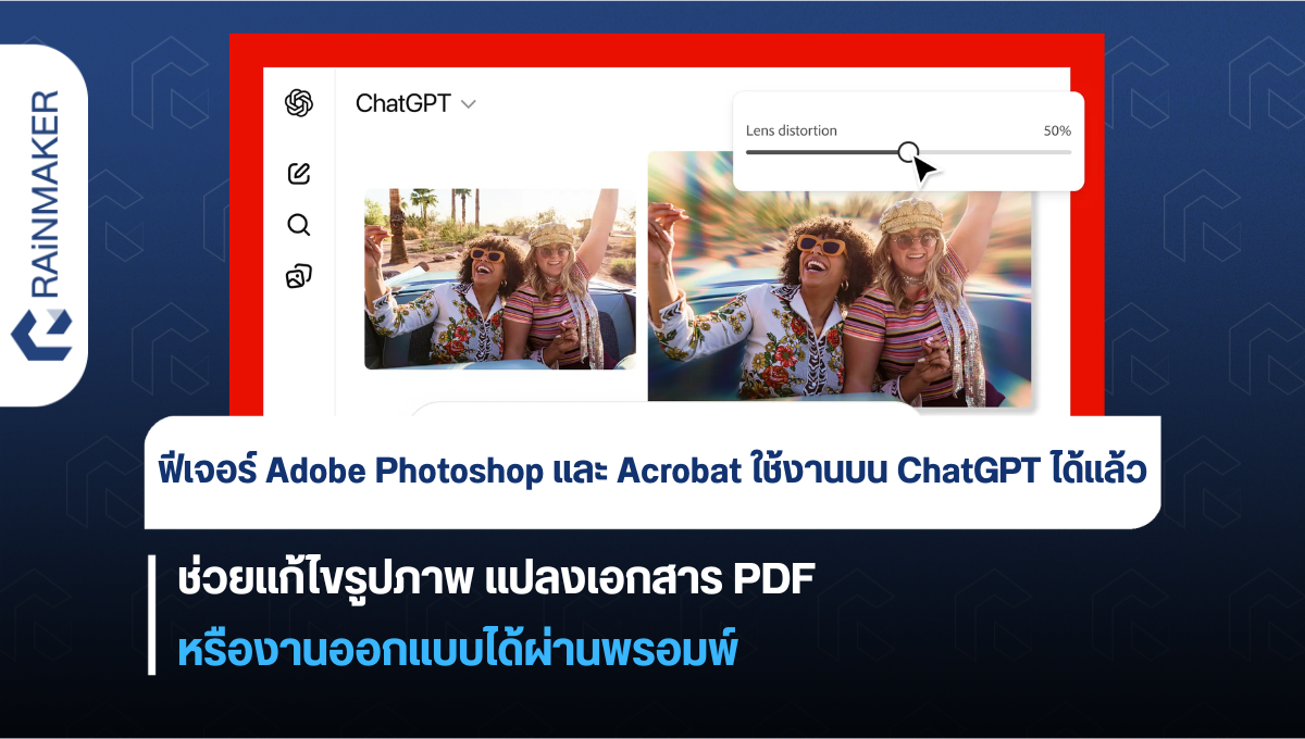 ตั้งแต่วันนี้เป็นต้นไปฟีเจอร์ต่าง ๆ ของ Adobe Photoshop, Adobe Acrobat และ Adobe Express จะสามารถเรียกใช้งานได้โดยตรงผ่าน ChatGPT แล้ว ซึ่งไม่ว่าจะใช้งานเพื่อแก้ไขรูปภาพ, แก้ไขเอกสาร PDF หรือออกแบบการ์ดและอื่น ๆ อีกมากมายก็ทำได้