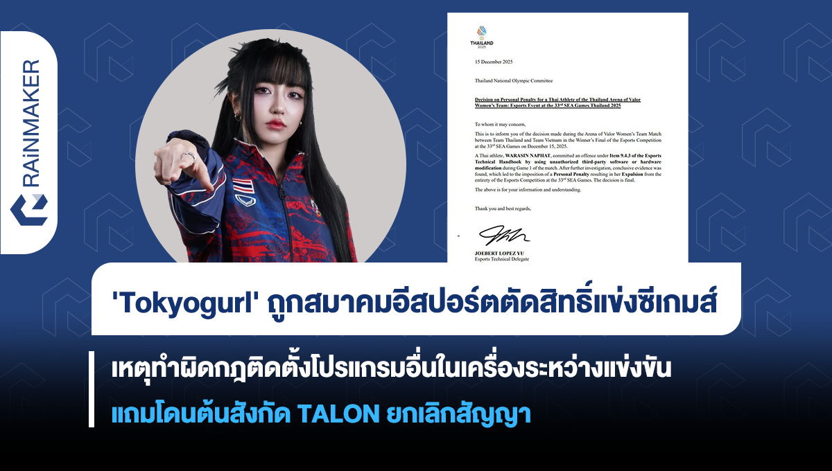 เป็นประเด็นร้อนในวงการอีสปอร์ตกันเลยทีเดียวกับกรณีนักกีฬาอีสปอร์ตสาว ‘Tokyogurl’ หรือ ณภัทร วราสินธ์ สมาชิกทีม Arena of Valor ที่เพิ่งถูกสมาคมกีฬาอีสปอร์ตแห่งประเทศไทย (TESF) ตัดสิทธิ์การแข่งขันซีเกมส์ ครั้งที่ 33 เนื่องจากมีการตรวจพบการติดตั้งโปรแกรมนอกเหนือจากที่กำหนดลงในอุปกรณ์สำหรับการแข่งขัน
