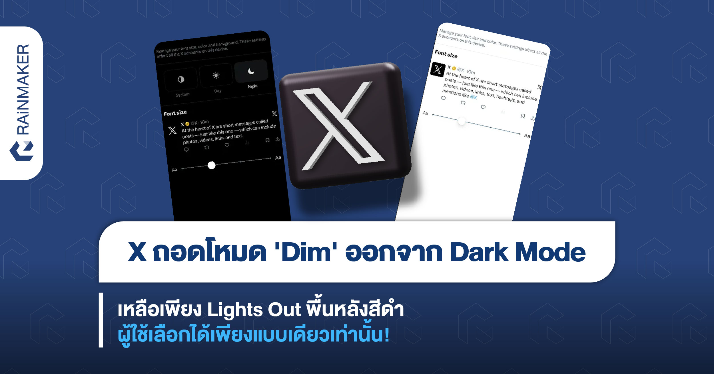 แพลตฟอร์มโซเชียลมีเดียอย่าง X กำลังทยอยปรับการตั้งค่าการแสดงผลภายในแอป โดยล่าสุดได้ทำการถอดตัวเลือก Dark Mode แบบ ‘Dim’ ออกไปจากระบบ ทำให้ผู้ใช้สามารถเลือกโหมดหน้าจอมืดแบบ Lights Out ได้เพียงแบบเดียวเท่านั้น!