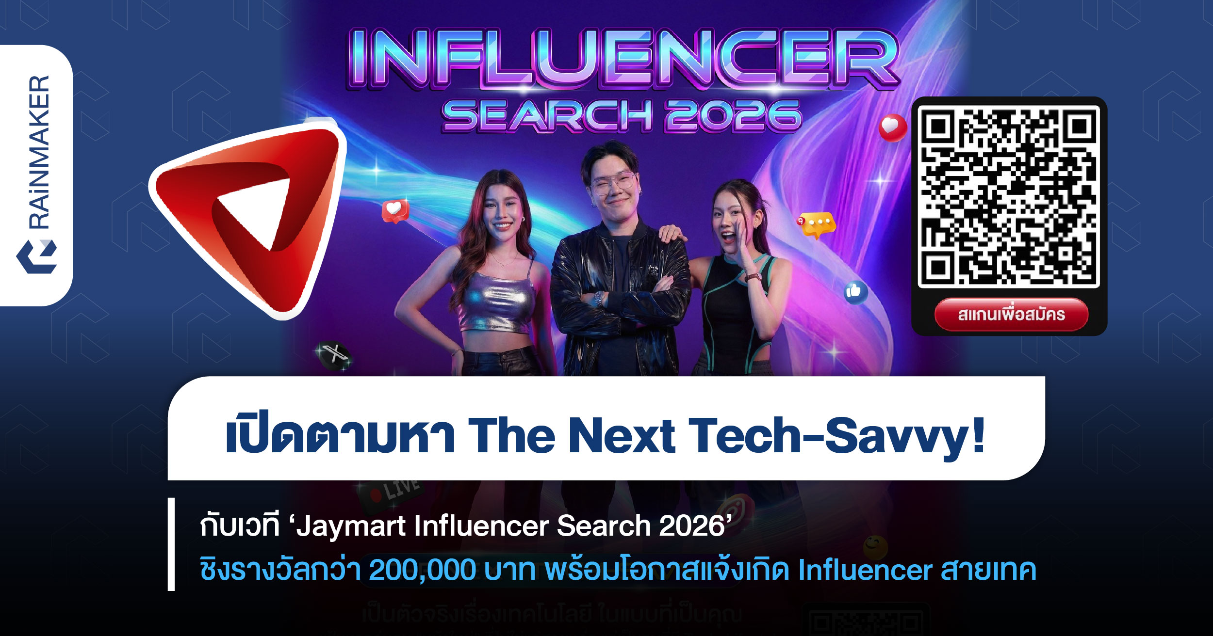 เจนใหม่ที่อินกับ Tech-Lifestyle เตรียมตัวให้พร้อม! เมื่อ ‘Jaymart’ เดินหน้าเปิดแคมเปญ ‘Jaymart Influencer Search 2026’ เพื่อค้นหา ‘The Next Tech-Savvy’ หรือครีเอเตอร์หน้าใหม่ที่สามารถเล่าเรื่องเทคโนโลยีให้เข้าถึงง่าย มีสไตล์ และสอดแทรกความสนุกในแบบของตัวเองได้อย่างลงตัว บอกเลยว่างานนี้ไม่จำเป็นต้องเหมือนใคร แต่ต้องชัดในตัวตน และเป็นตัวจริงในสายนี้