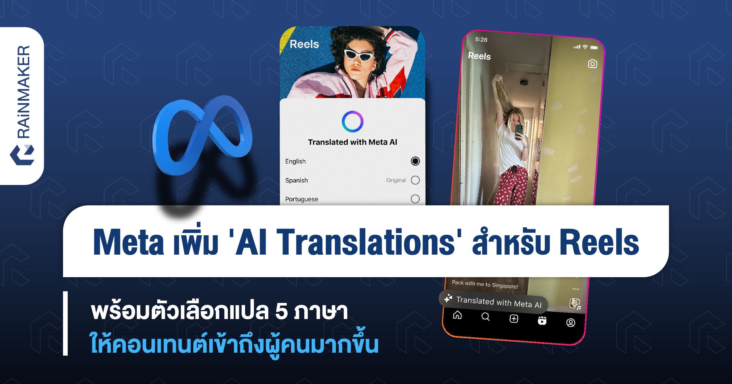 เมื่อสัปดาห์ที่ผ่านมา Meta ได้ประกาศอัปเดตให้ Reels มีตัวเลือก ‘AI Translation’ หรือใช้ AI ในการแปลภาษาคอนเทนต์วิดีโอได้ ซึ่งตอนนี้มีเพิ่มเข้ามา 5 ภาษาในการขยายให้คอนเทนต์เข้าถึงผู้คนได้มากขึ้น ทำให้ทั้ง Facebook และ Instagram จะมีตัวเลือก ‘Meta AI translation’ ขึ้นมานั่นเอง