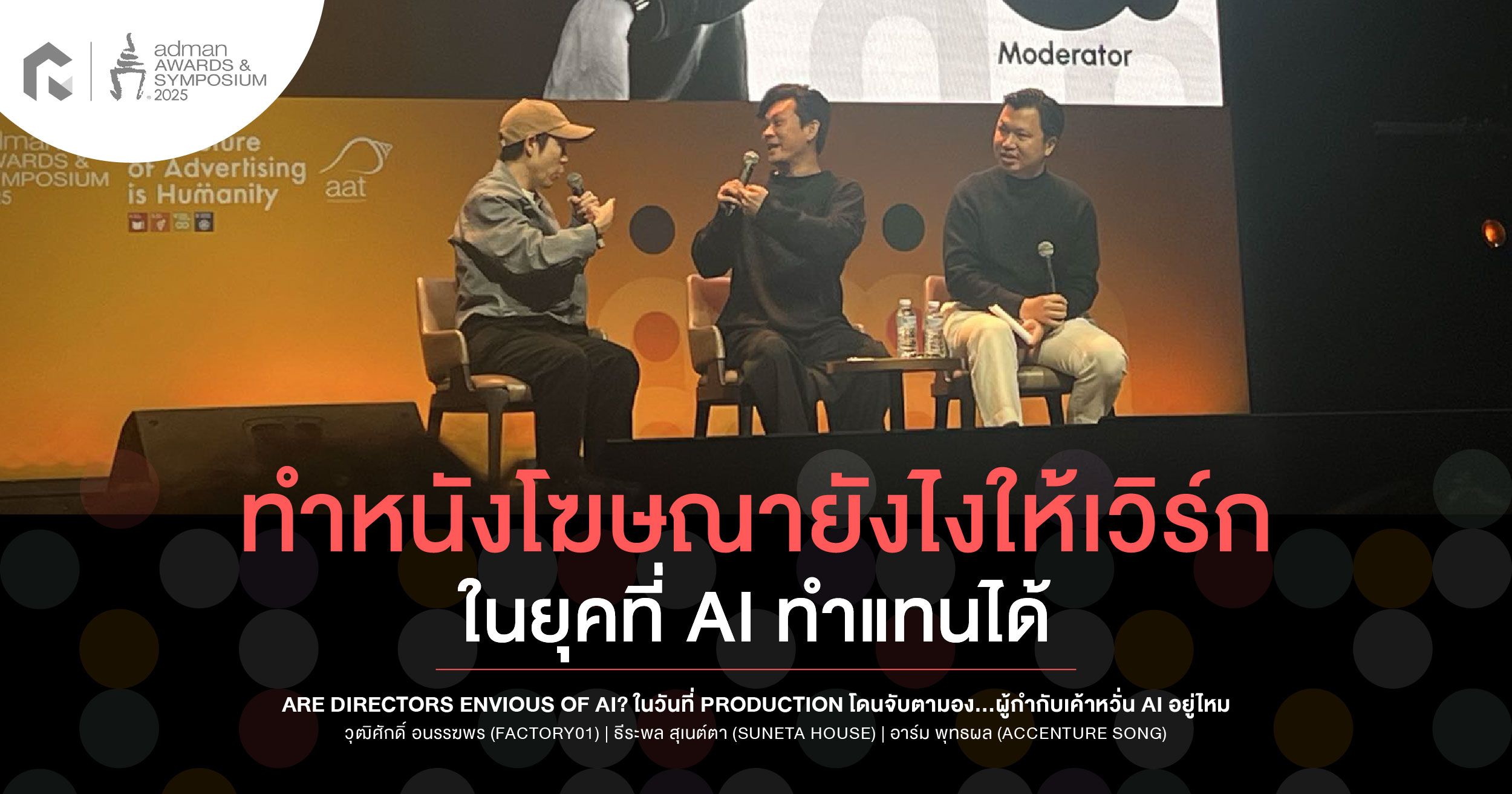สรุป ‘ทำหนังโฆษณายังไงให้เวิร์ก ในยุคที่ AI ทำแทนได้’ ใน Session: Are directors envious of AI? ในวันที่ Production โดนจับตามอง…ผู้กำกับเค้าหวั่น AI อยู่ไหม? ที่งาน Adman Awards And Symposium2 025: The Future Of Advertising Is Humanity โดย วุฒิศักดิ์ อนรรฆพร (Factory01), ธีระพล สุเนต์ตา (Suneta House) และอาร์ม พุทธผล (Accenture Song)