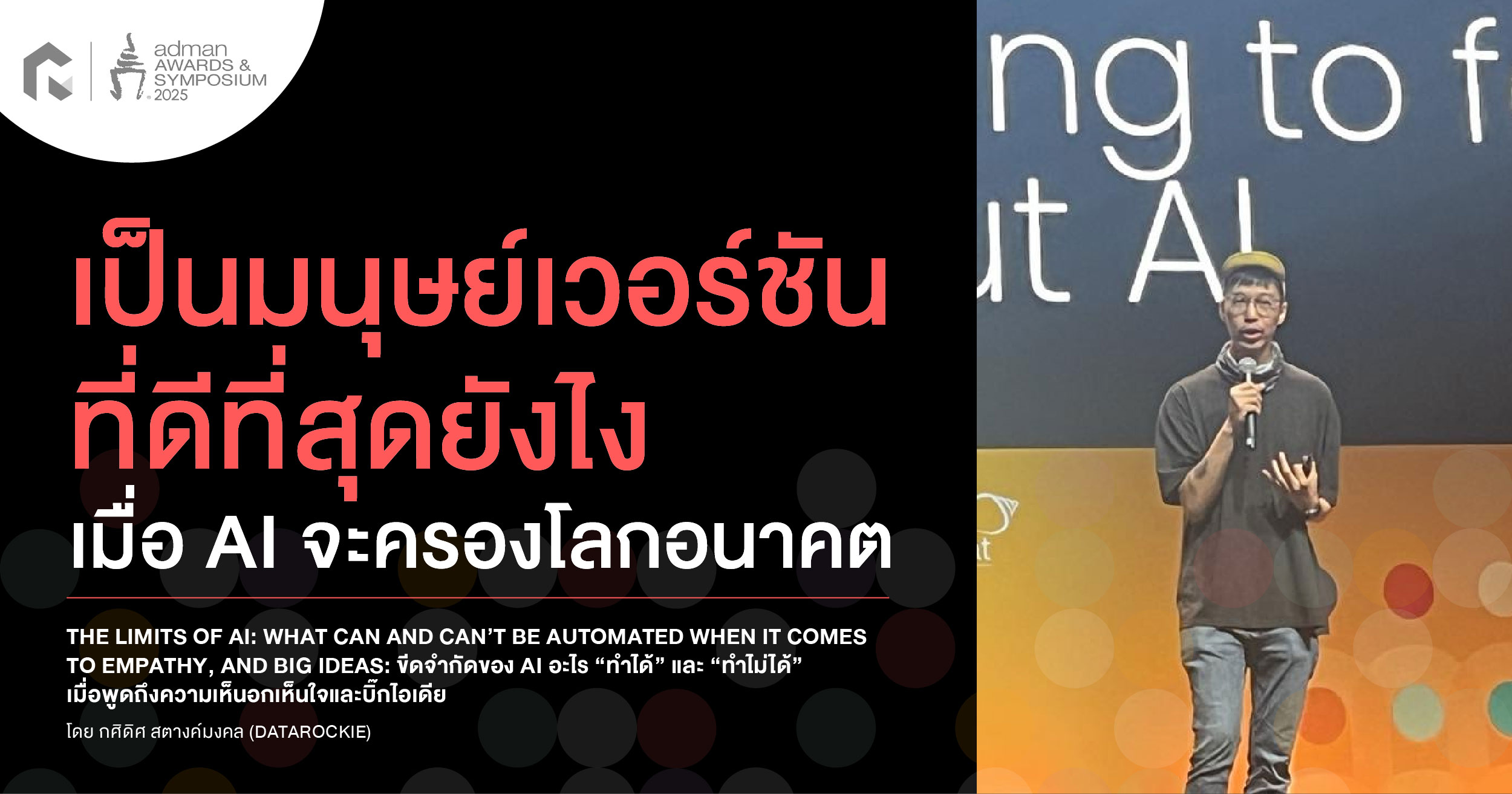 สรุป ‘เป็นมนุษย์เวอร์ชันที่ดีที่สุดยังไง เมื่อ AI จะครองโลกอนาคต’ ใน Session: The limits of AI: What can and can’t be automated when it comes to empathy, and big ideas: ขีดจำกัดของ AI อะไร “ทำได้” และ “ทำไม่ได้” เมื่อพูดถึงความเห็นอกเห็นใจและบิ๊กไอเดีย โดย กศิดิศ สตางค์มงคล (DataRockie) ที่งาน Adman Awards And Symposium2 025: The Future Of Advertising Is Humanity