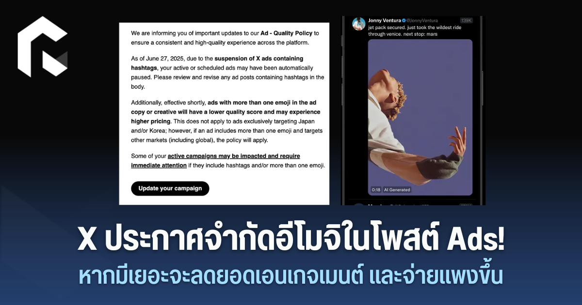 เมื่อเดือนที่แล้ว X ได้ประกาศแบนการใช้แฮชแท็กจากโพสต์โฆษณาไป ต่อให้จะเคยเป็นแพลตฟอร์มที่โดดเด่นด้านนี้มากเท่าไหร่ก็ตาม เพราะมองว่าทำให้ไขว้เขวจากจุดประสงค์ของโฆษณาได้ และครั้งนี้อีโมจิก็จะถูกจำกัดการใช้งานสำรับโฆษณาเช่นกัน และหากใช้มากกว่า 1 ตัวในโฆษณาก็จะทำให้ยอดเอนเกจเมนต์ต่ำลงไปด้วย