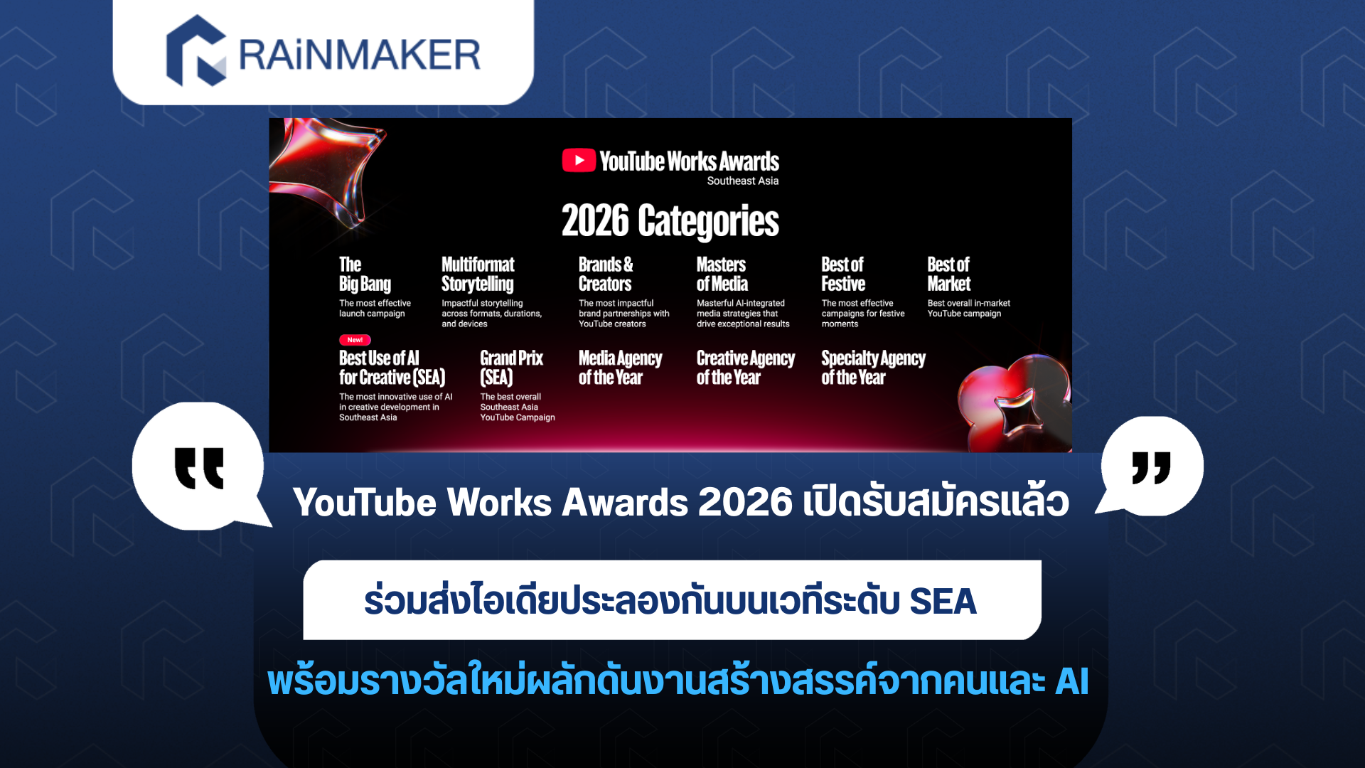 YouTube ประเทศไทย เตรียมเปิดรับสมัครให้ผลงานโฆษณาให้ร่วมส่งผลงานเข้าชิงในเวทีประกวดการงานโฆษณาอย่าง YouTube Works Awards Southeast Asia 2026 ที่มาพร้อมการเปิดตัวรางวัลสาขาใหม่ สำหรับแคมเปญที่ผสานพลังความคิดสร้างสรรค์ของมนุษย์เข้ากับ AI ได้อย่างลงตัว